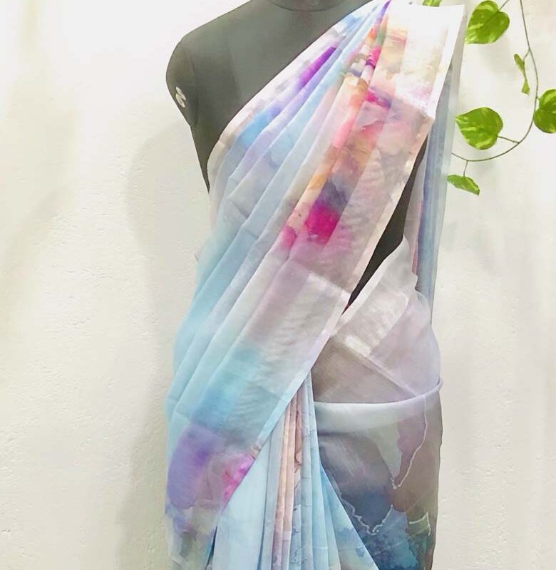Linen-cotton blend saree with a 3D digital print, comes with an unstitched running blouse piece. (Color-Sky Blue )