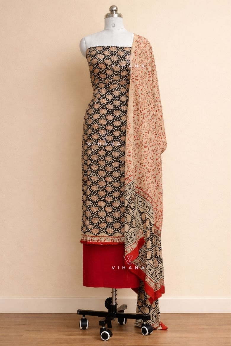 Modal Muslin Silk Bagru Print Salwar Suit Material -Black Paisley Elegance