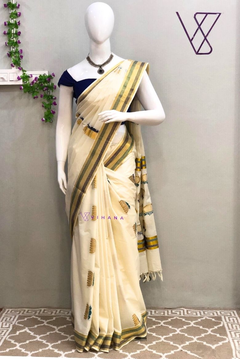 Handloom Kerala Cotton Lotus Jacquard Weaving Set Saree