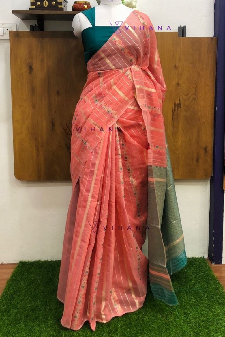 Light Pink Linen Cotton Jamdhani Floral Weave Sareee
