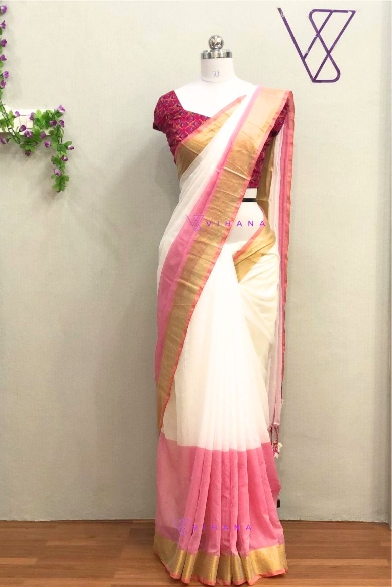 Off white Mul Cotton Saree with Pink and Golden Zari Stripe Borders
