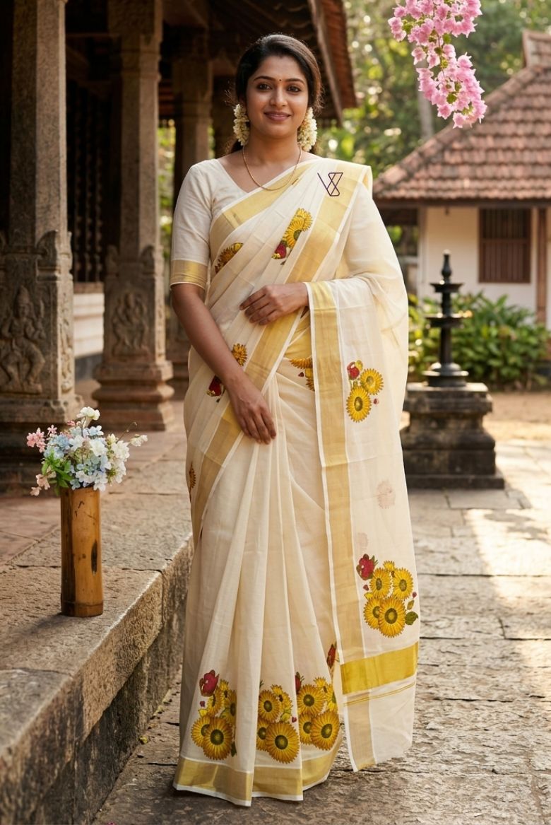 Kerala Golden Tissue set saree Sunflower Print