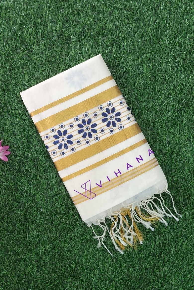 Elegant Off-White Cotton Set Saree with Golden Zari Border and Blue Floral Prints
