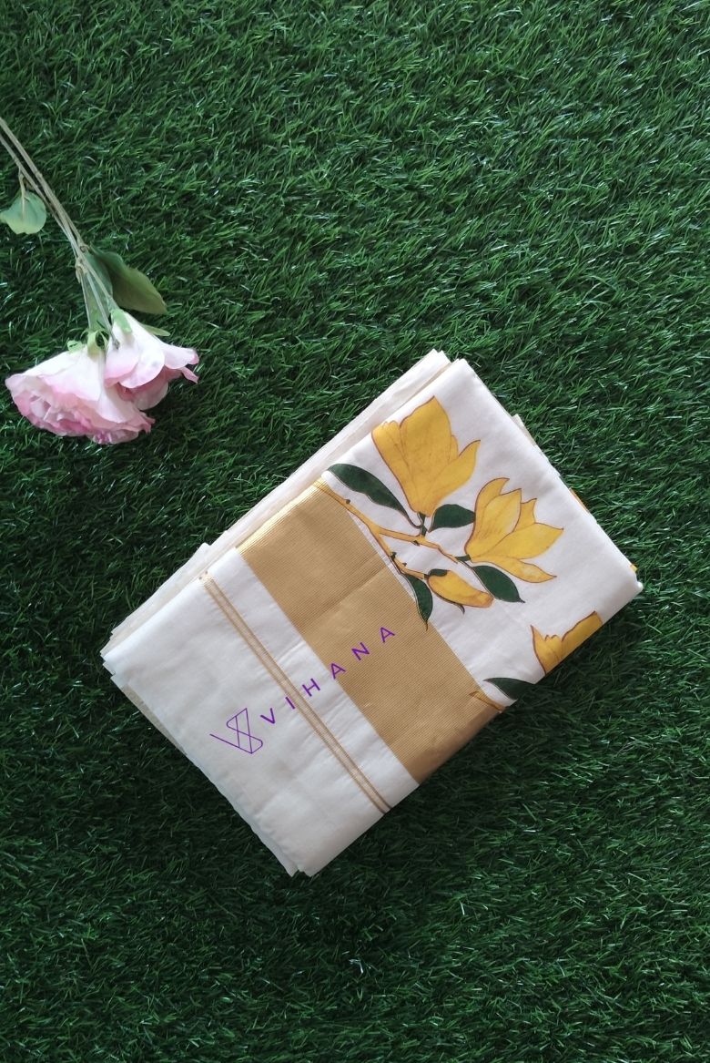 Elegant Kerala Kasavu Saree with Hand-Painted Yellow Florals