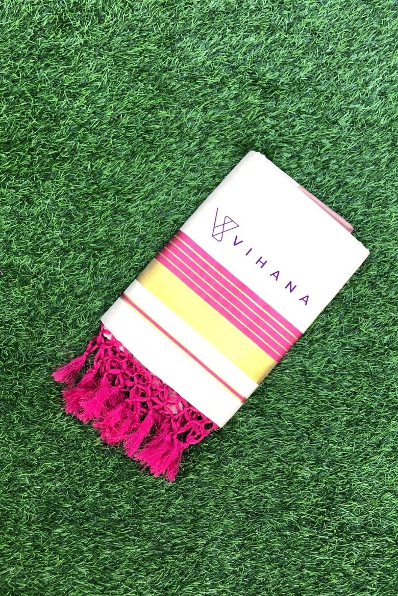 Kerala Cotton Premium Set Saree with Pink Border and Gold Zari Woven Floral Designs