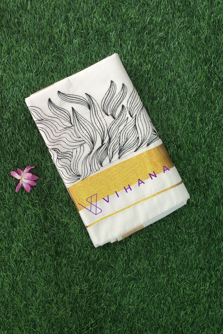Kerala Set Saree with Black Thread Embroidery Designs