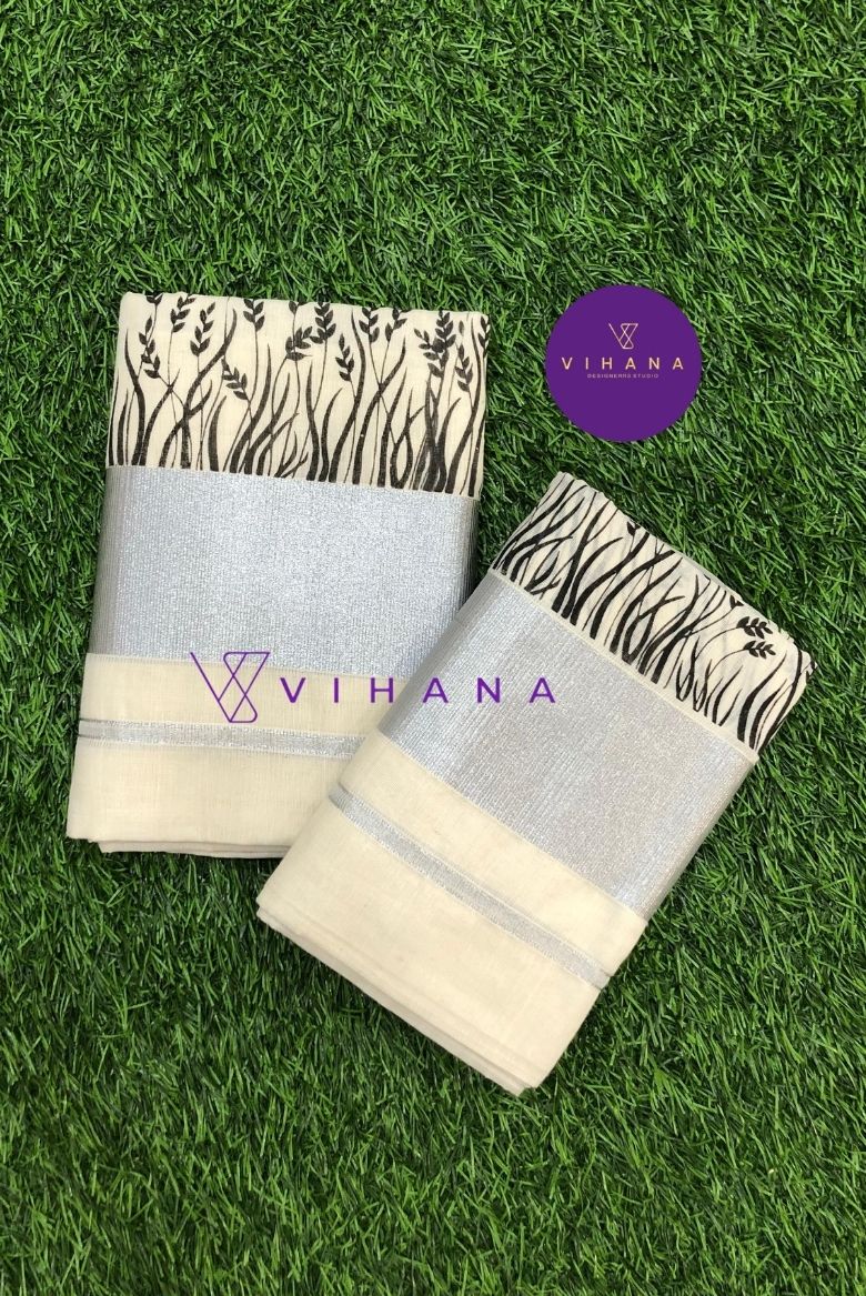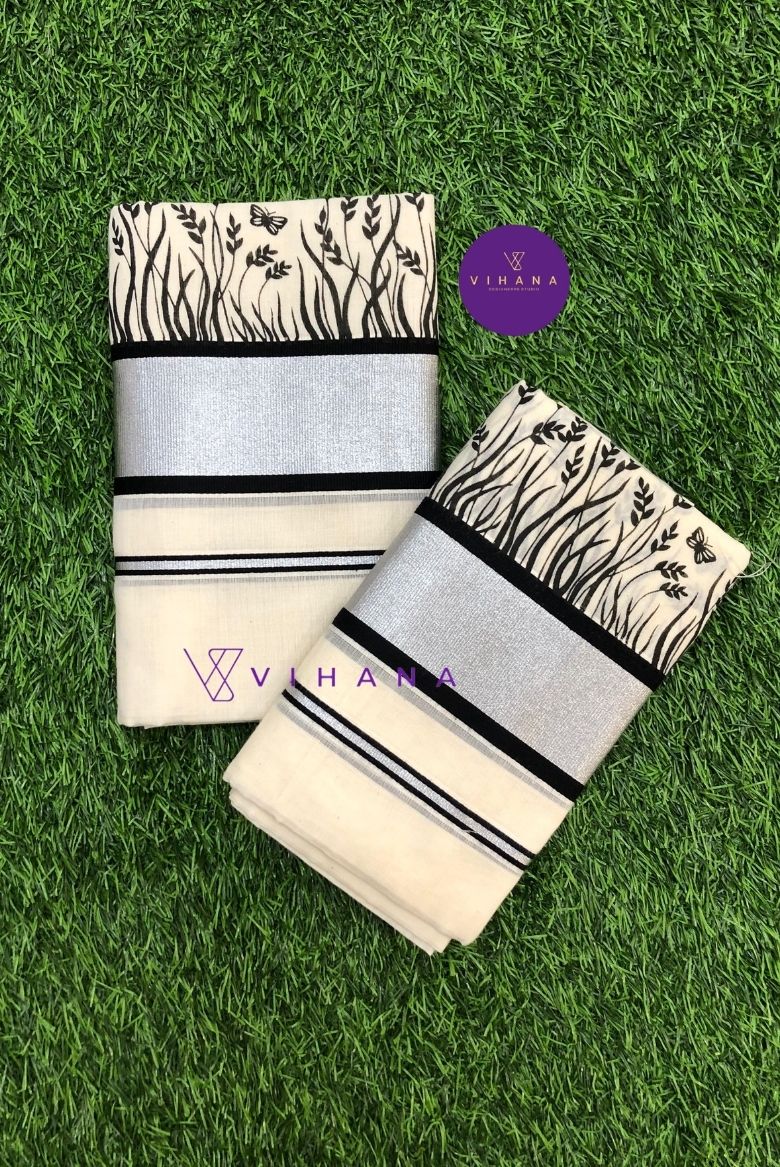 Elegant Cotton Set Mundu with Silver Border and Black Leaf Print