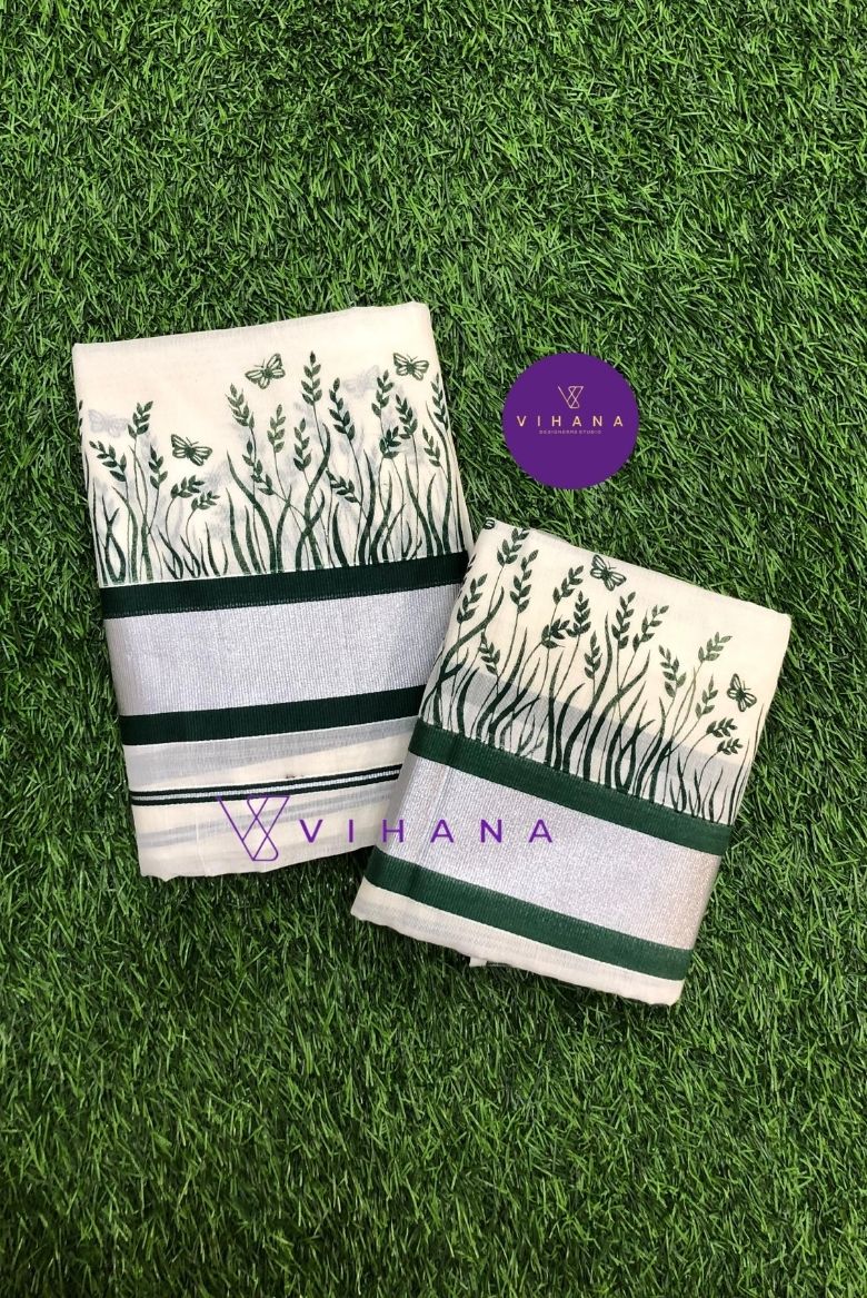 Elegant Cotton Set Mundu with Green Leaf Print