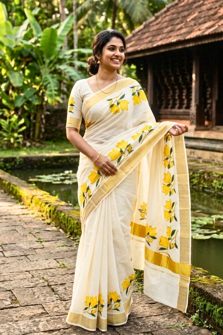 Elegant Kerala Kasavu Saree with Hand-Painted Yellow Florals