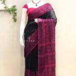 This saree features a striking geometric grid pattern with vibrant criss-cross lines in multiple colors, including orange, purple, green, and yellow. The design offers a contemporary twist on traditional Indian wear.
