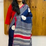 This saree features large white Polka dot allover the body part , white stripe lines along with red thick borders and having an elegant matching Pallu.