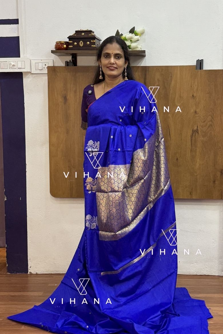 This saree is striking shade of violet and blue , features intricate floral /leaf motifs gold zari weaving across the body ; and have an elegant Pallu .