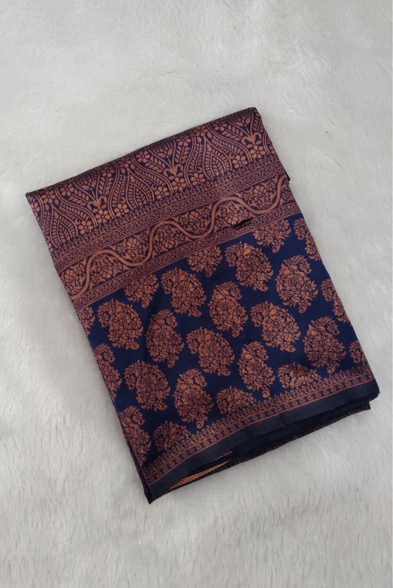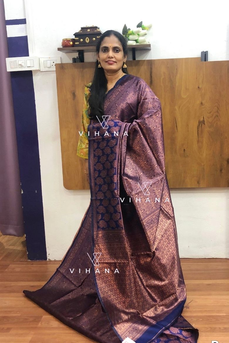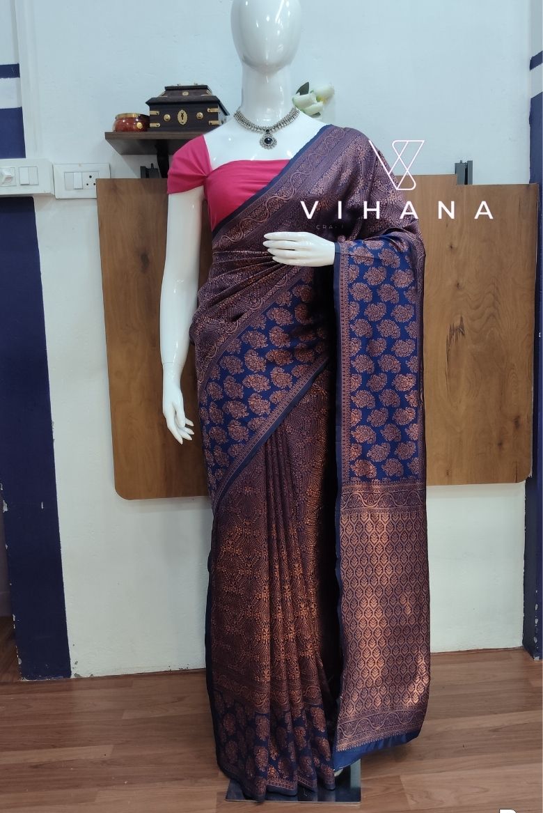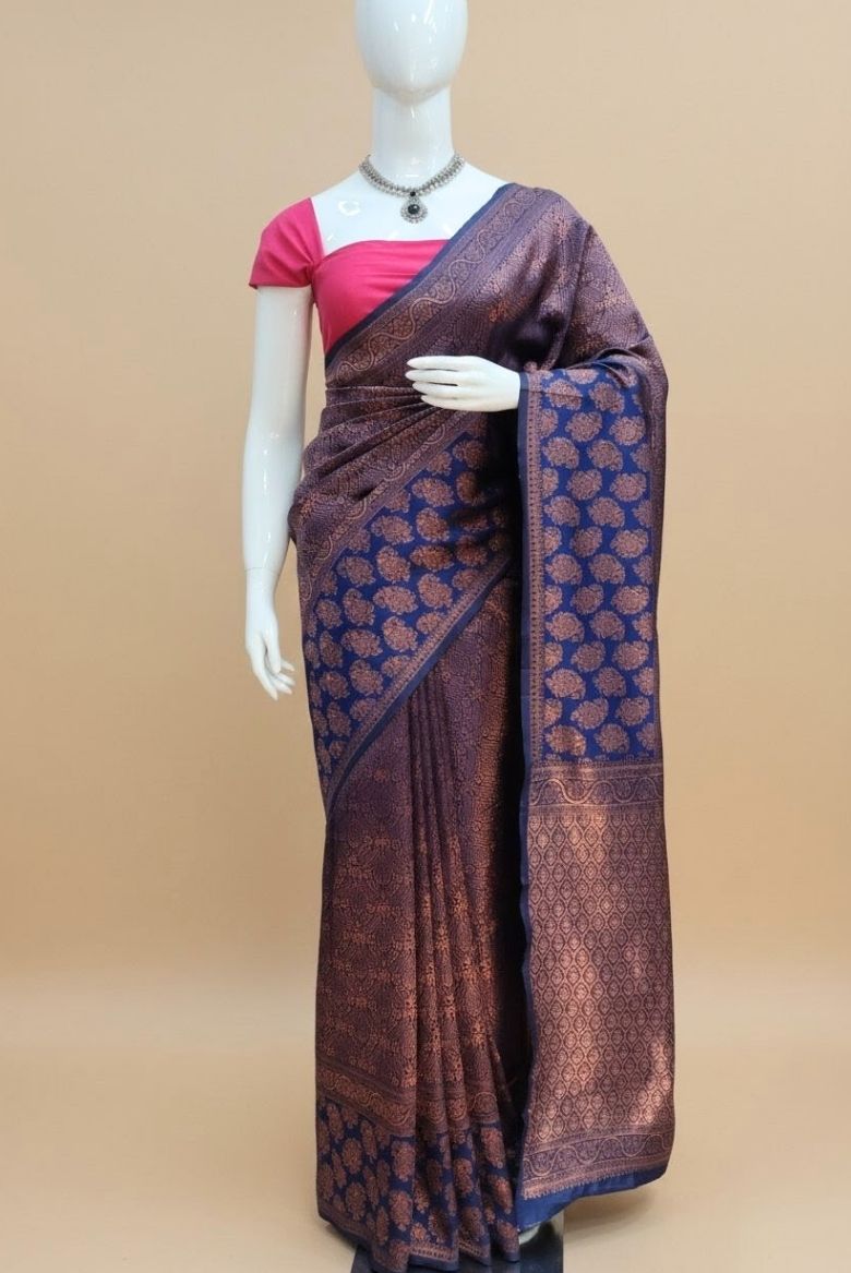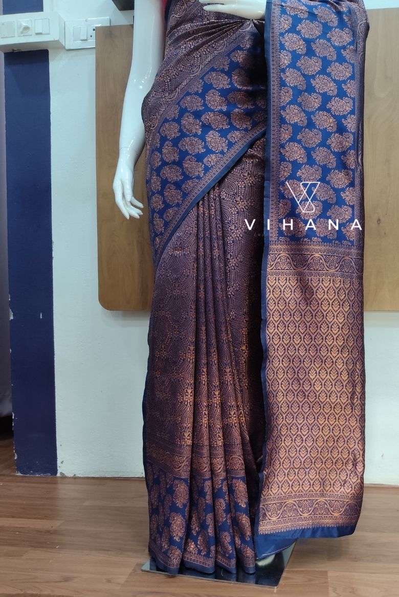 A rich navy blue banarasi style saree featuring intricate allover small geometrical pattern with zari weaving and a heavily bold floral buttas designed Pallu.