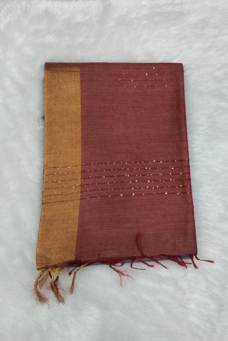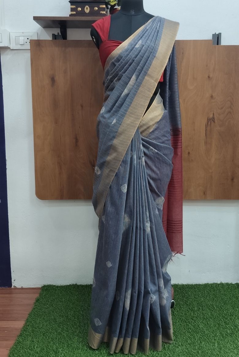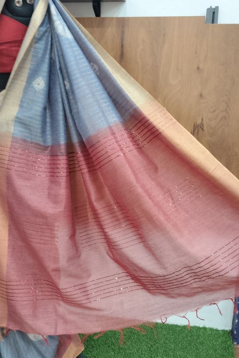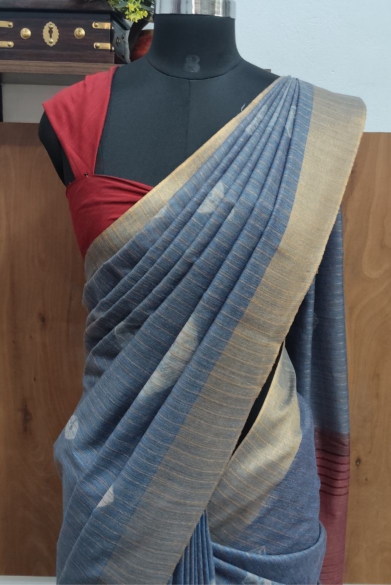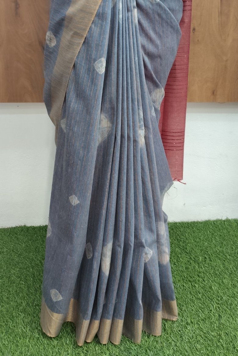 This is a Bhagalpuri Silk Saree in a muted Blueish Grey tone with subtle Bhandini motifs . The Pallu in a Pastel Maroon shade with horizontal stripes and a golden zari edge borders.