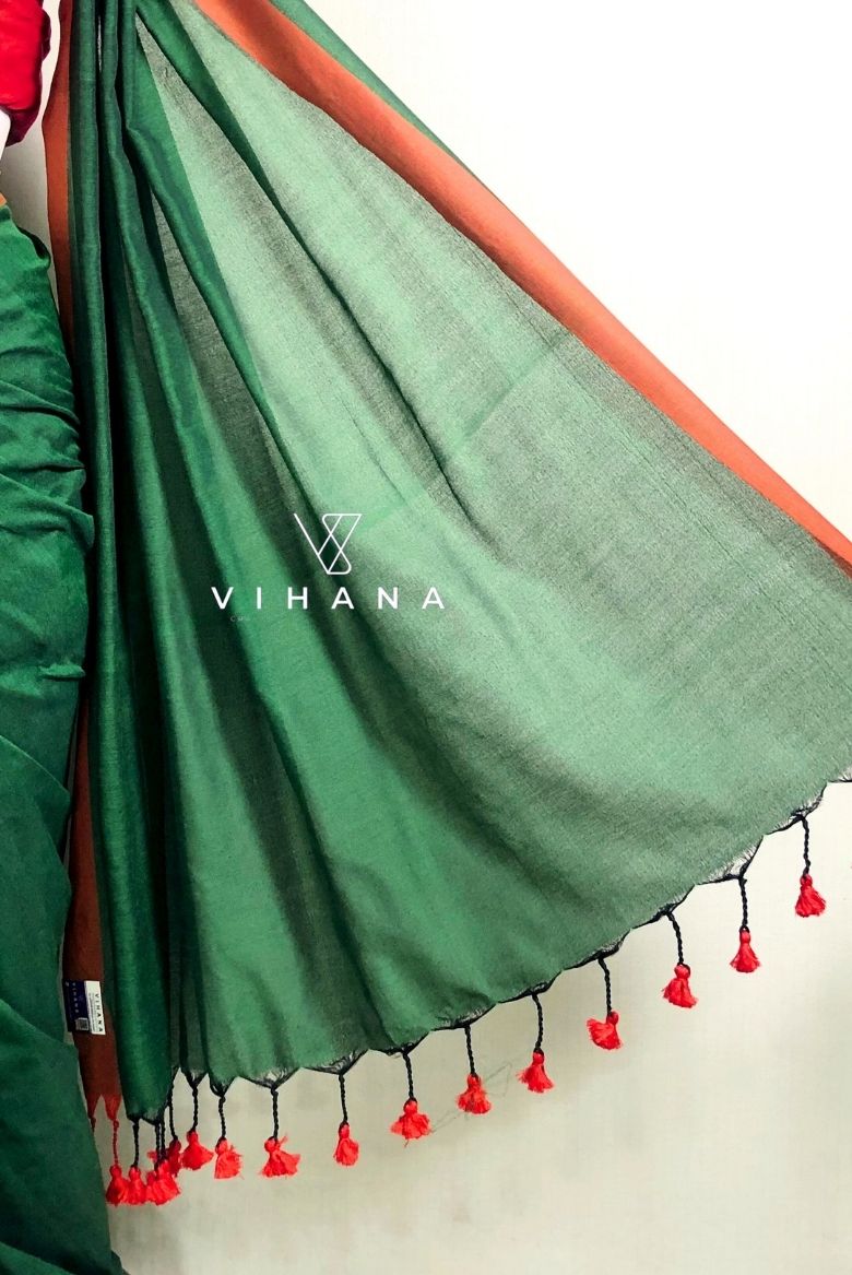 The body of this pure khadi cotton saree is a bottle green, accented by a broad red orange border and matching tassels on the pallu.
