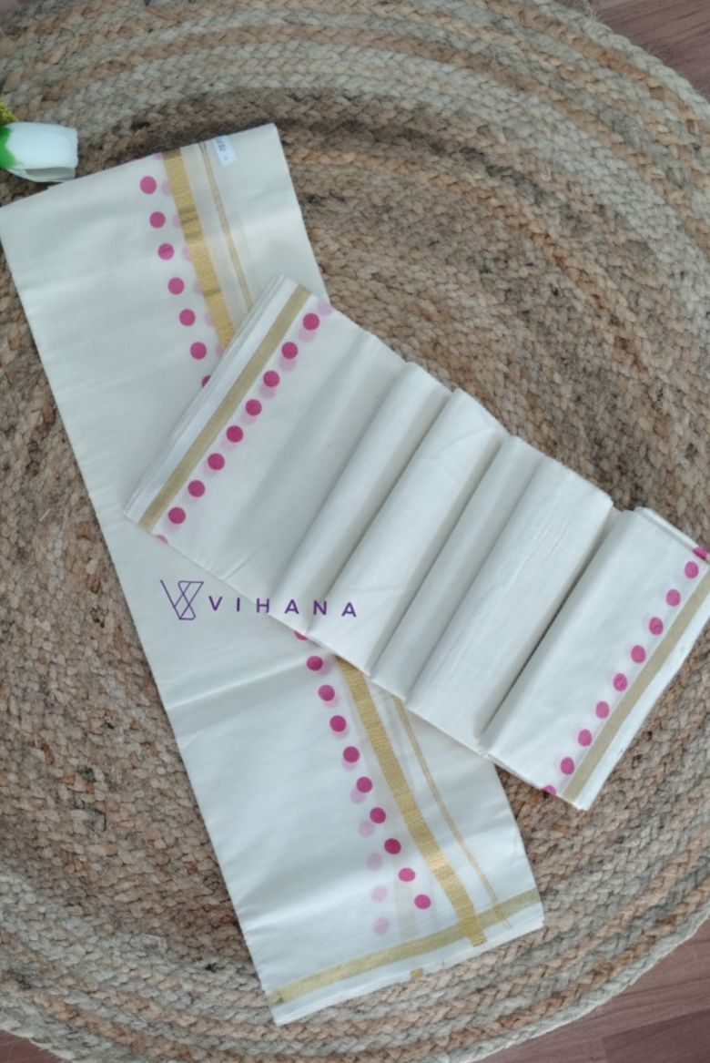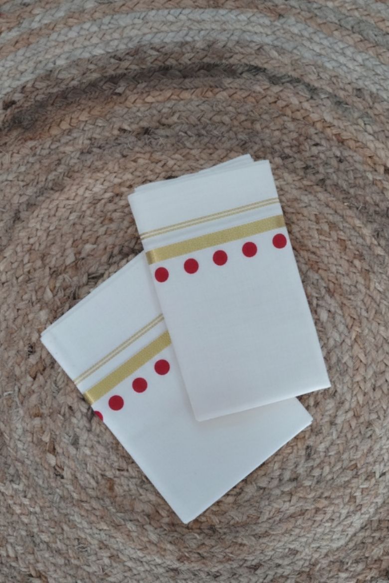 This set mundu features a pattern of red polka dots and a traditional golden kasavu border.