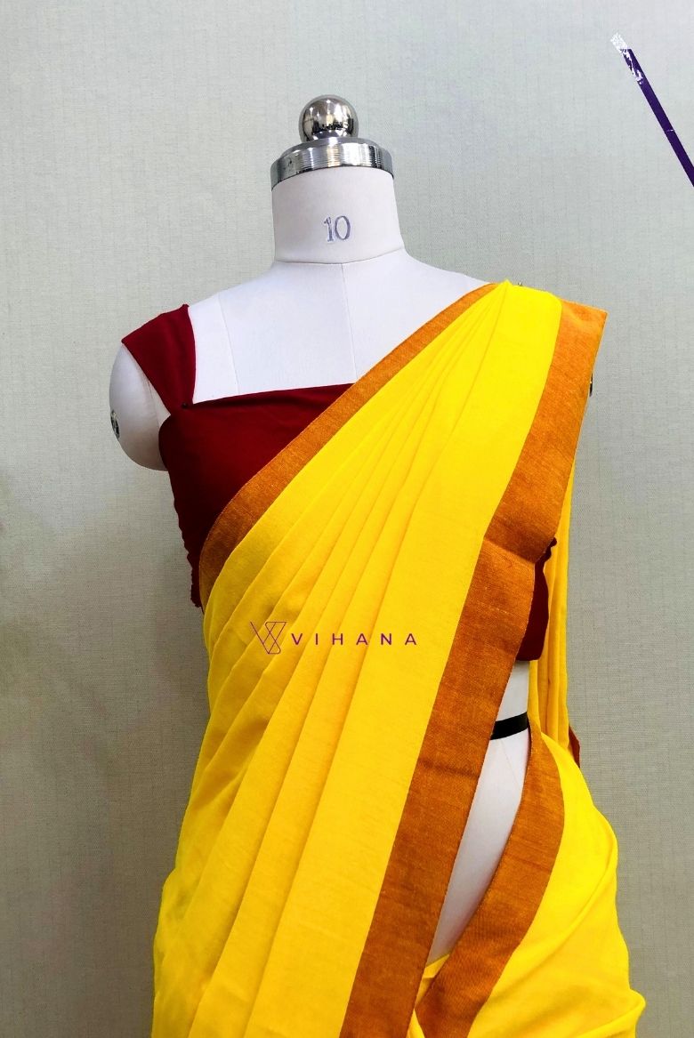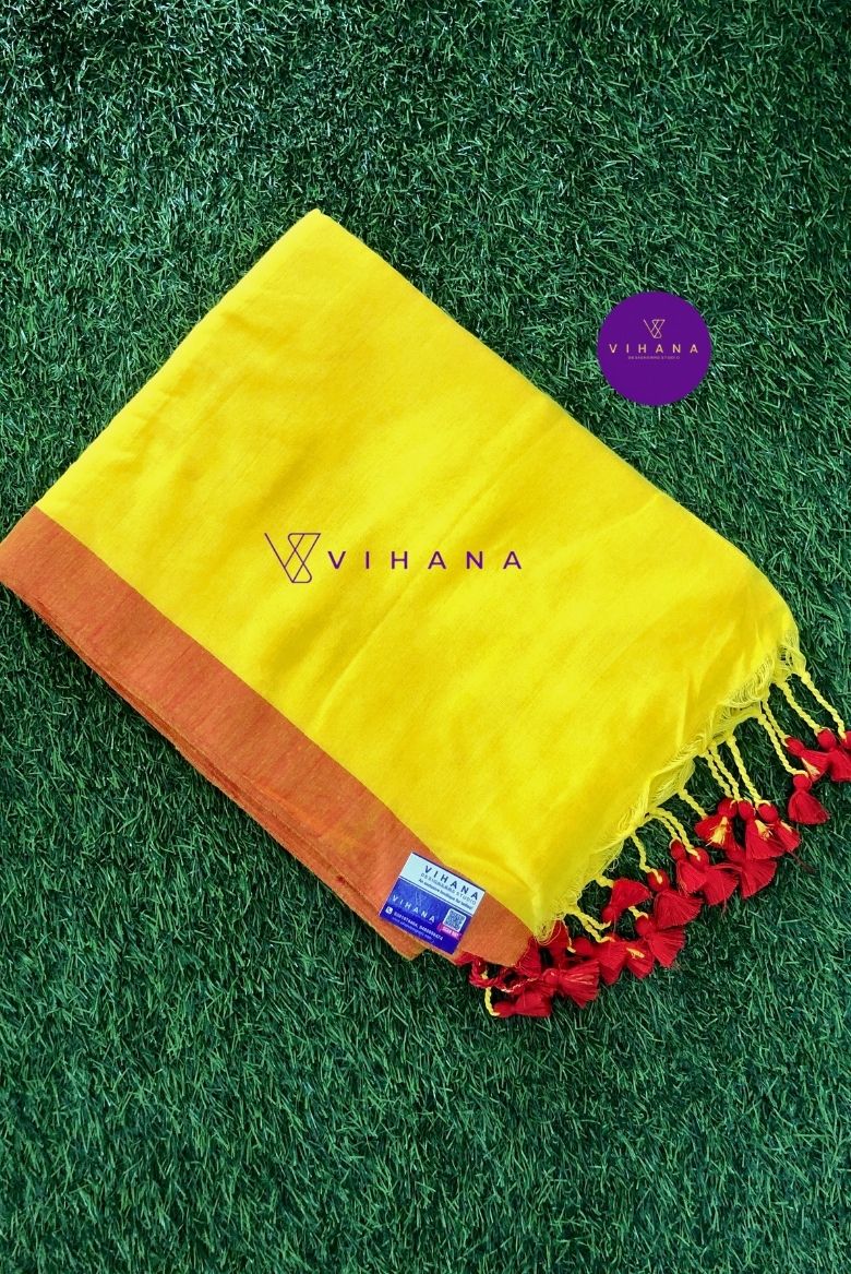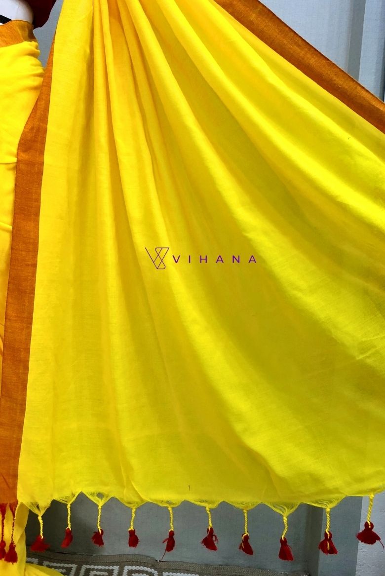 The body of this pure khadi cotton saree is a Bright yellow, accented by a broad red border and matching tassels on the pallu.