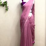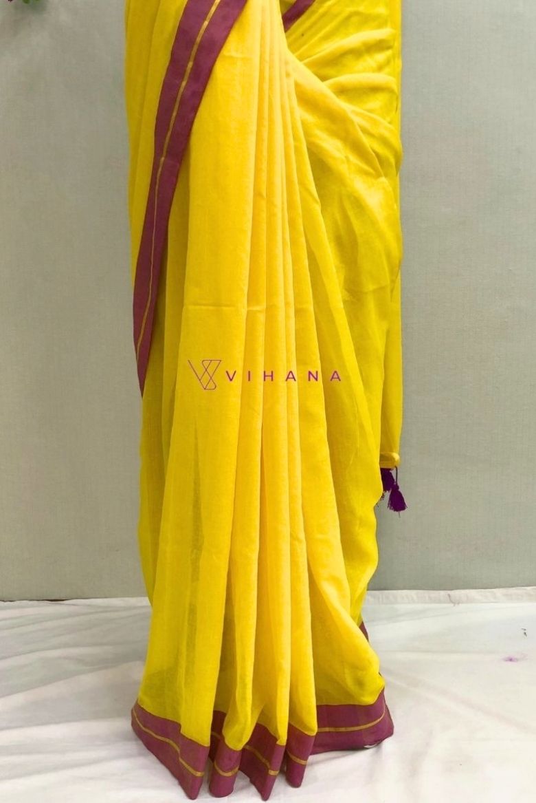 This saree is crafted from pure Mul cotton, a soft and breathable fabric celebrated for its lightweight feel and fine weave. The body features a bright, solid yellow hue, contrasted beautifully by a rich purple border.
