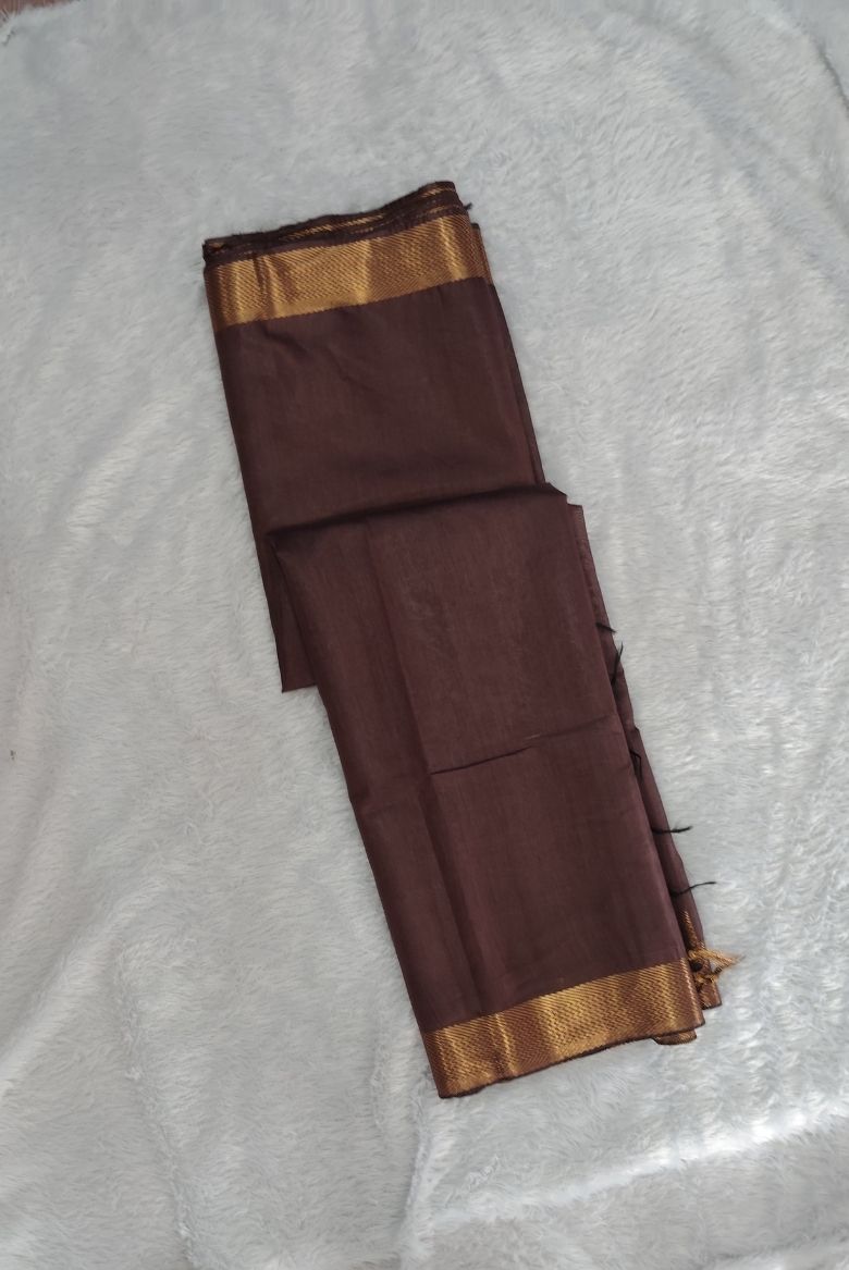 This saree features a rich brown body with a prominent wide golden zari border . The Pallu is highlighted with that same Golden zari stripe designs.