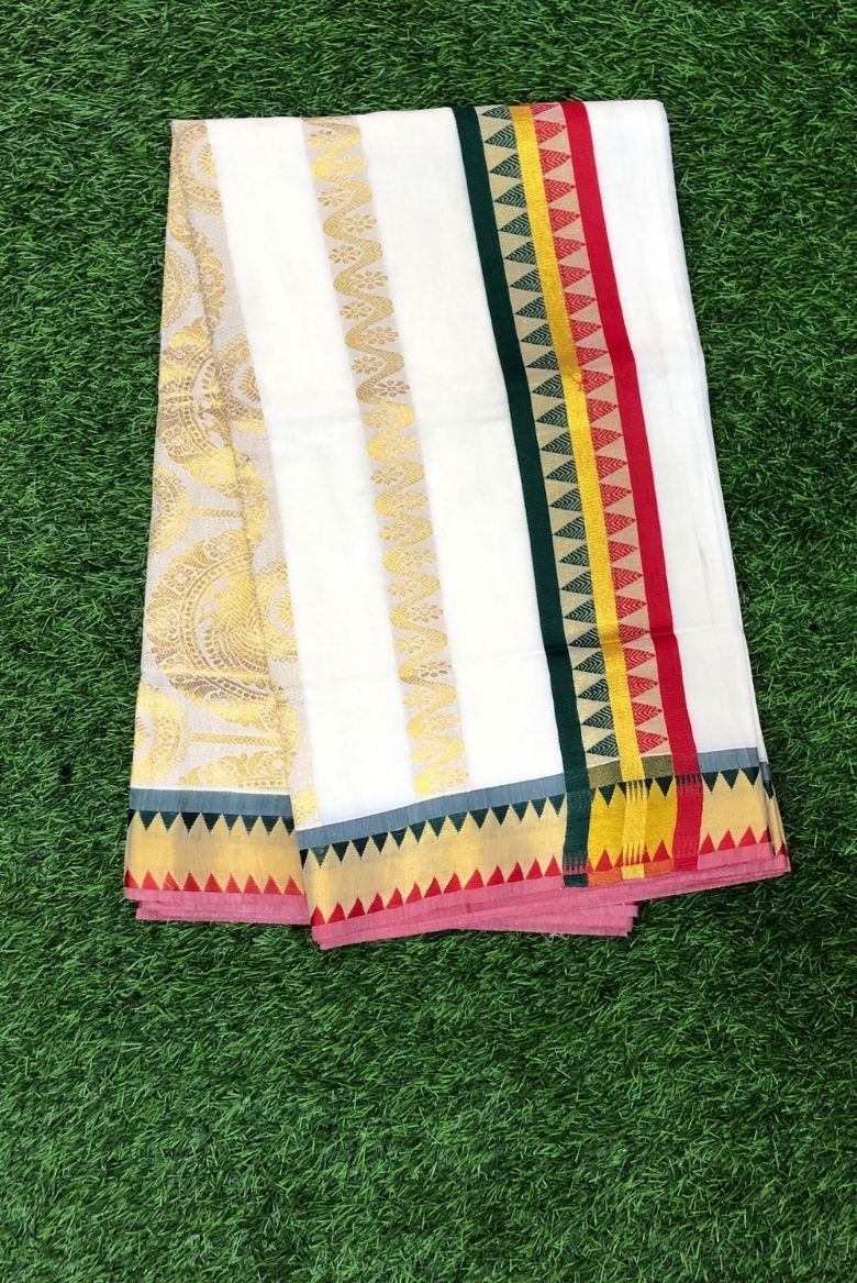Be the first to review “Classic Kerala Kasavu Set Saree with Multicolour Temple Border” Cancel reply
