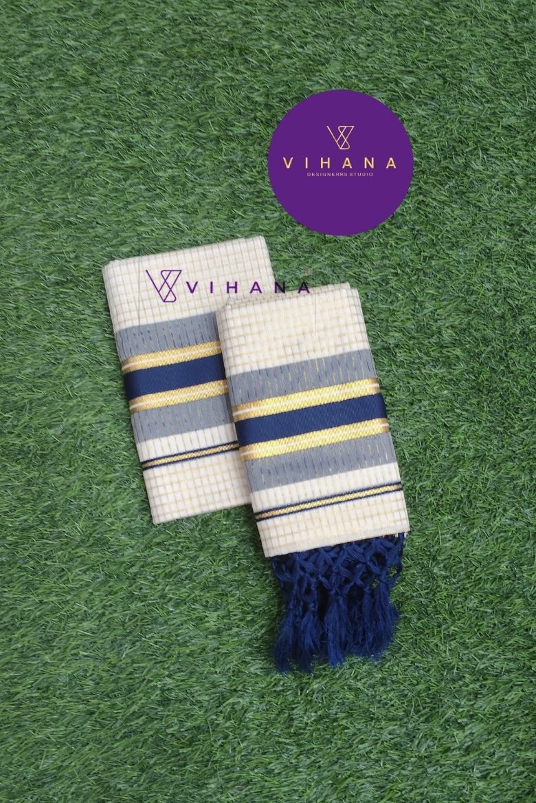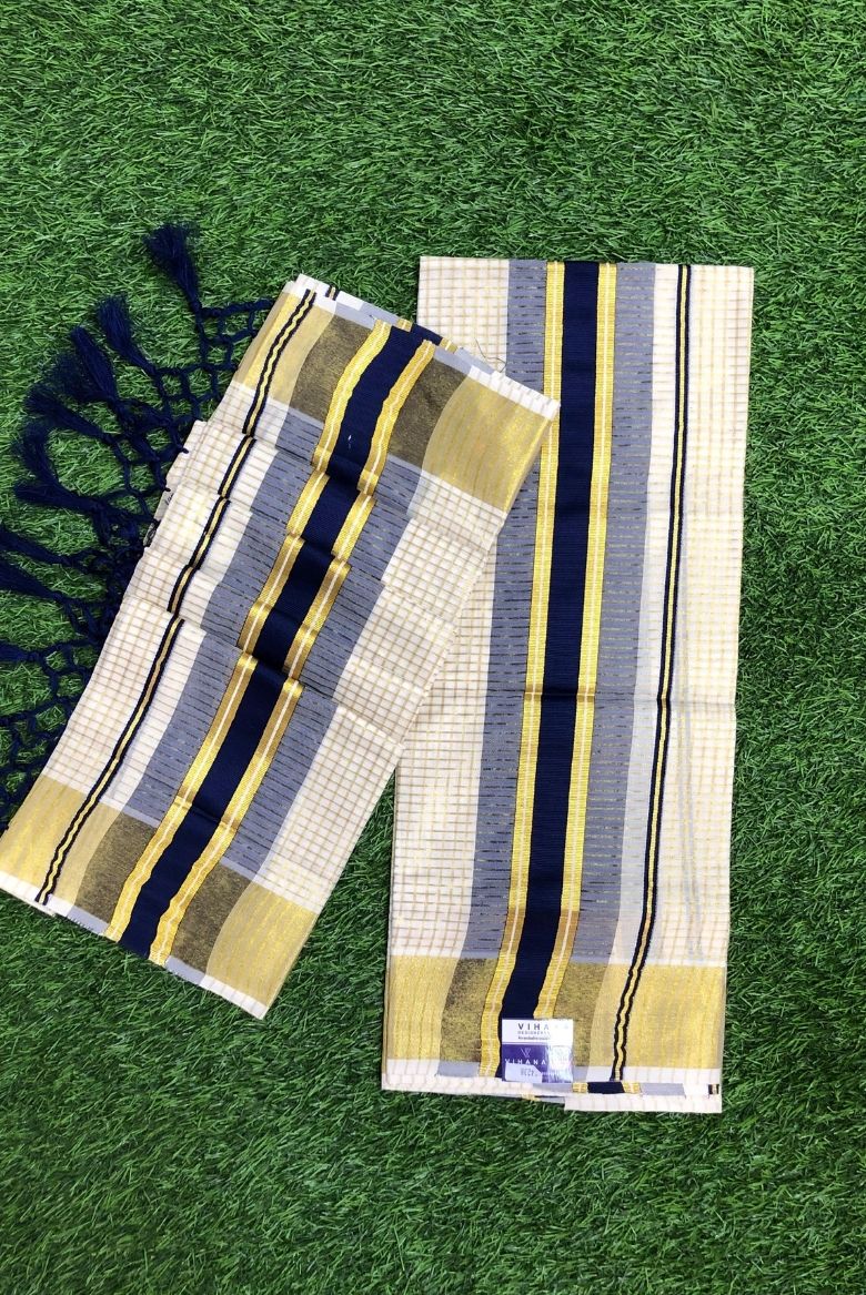This set mundu Featuring a pristine off-white body adorned with subtle textured checks, this set mundu is elevated by bold navy blue and gold zari borders that add a touch of festive charm. The matching neriyathu comes with neatly finished navy blue tassels, enhancing its traditional appeal.