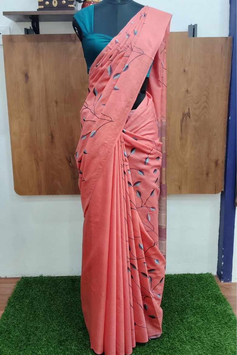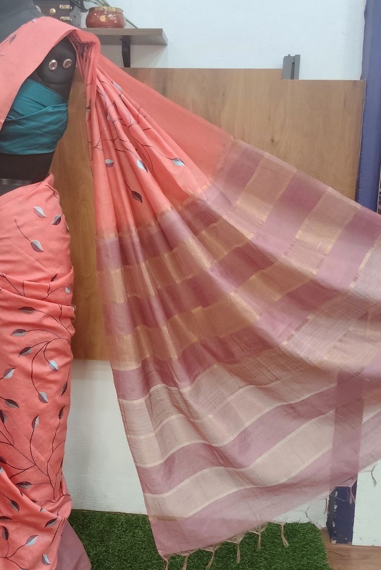 Be the first to review “Coral Peach Kota Munga Silk Embroidery Saree” Cancel reply