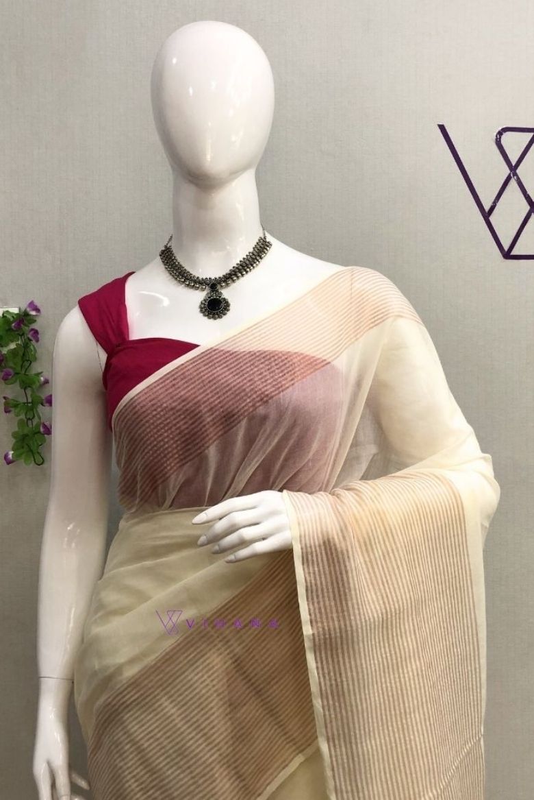 19 February 2026Cream Mul cotton Saree with Copper zari Stripes Border Design
