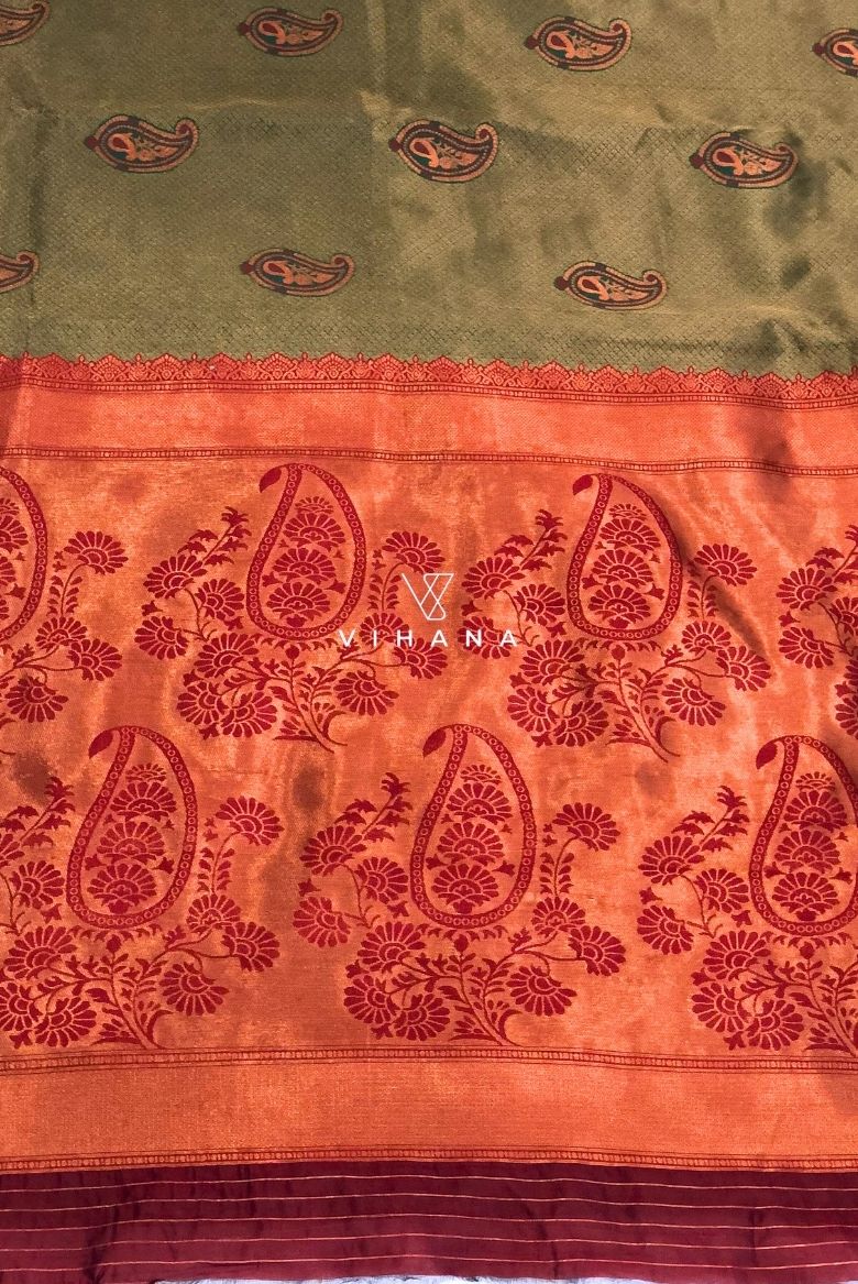 The main body is a Dark green with a subtle textured weave and a large, ornate Paisley motif in the center, rendered in maroon and green tones. This saree pallu features an ornate deign in a striking maroon , transitioning from a dark green body adorned with paisley motifs.