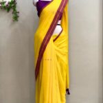 Bright Yellow Mul Cotton Saree with Purple and Golden zari Border