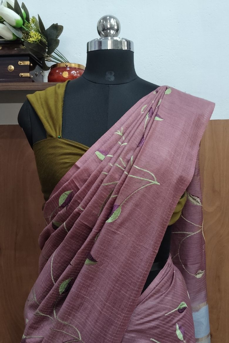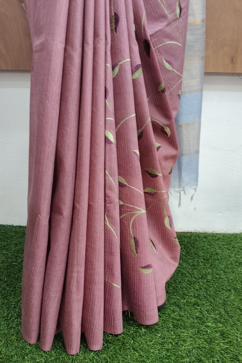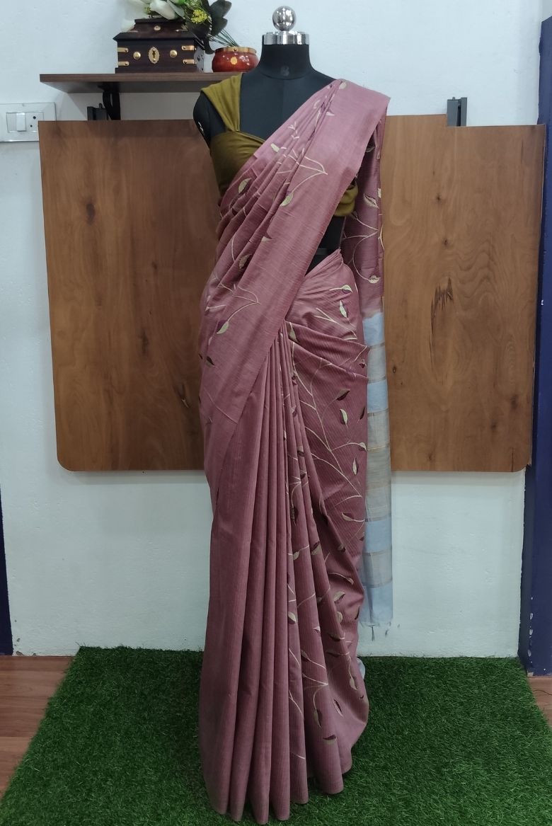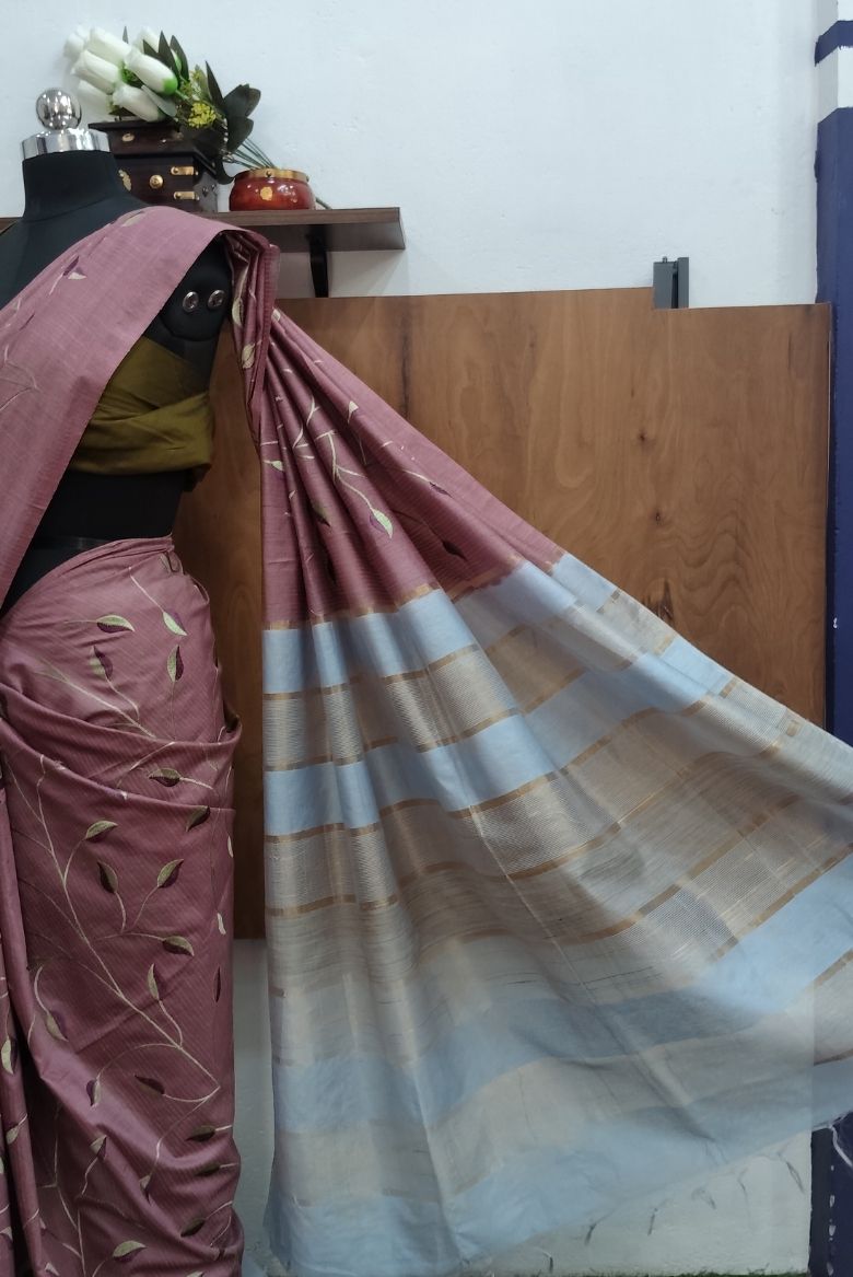 This Kota Munga Silk Saree featuring elegant leaf pattern embroidery , Pallu has a shade with simple golden zari border.