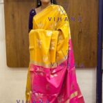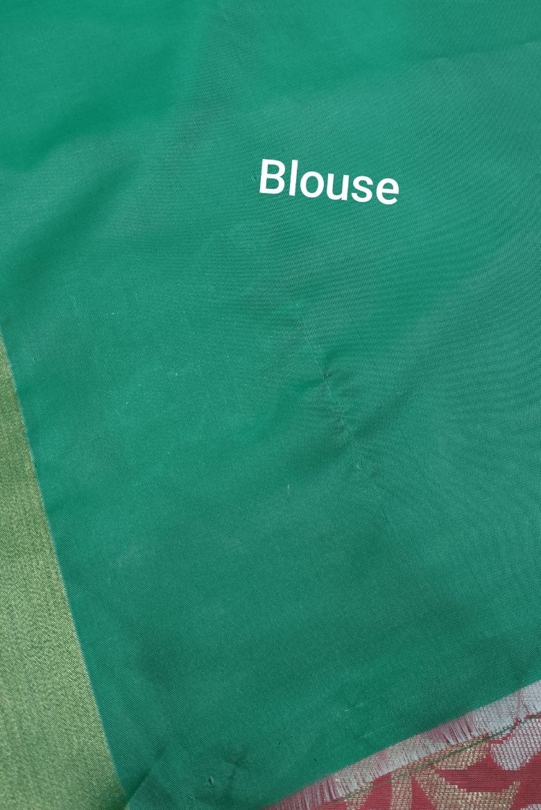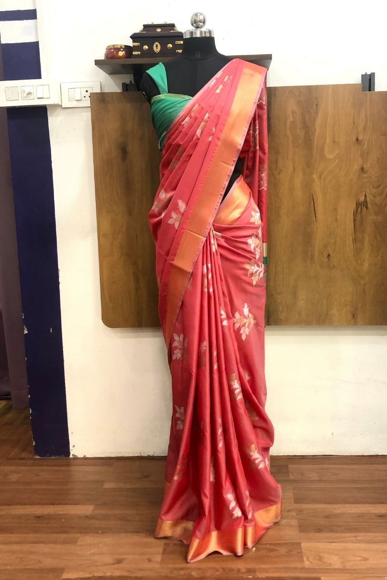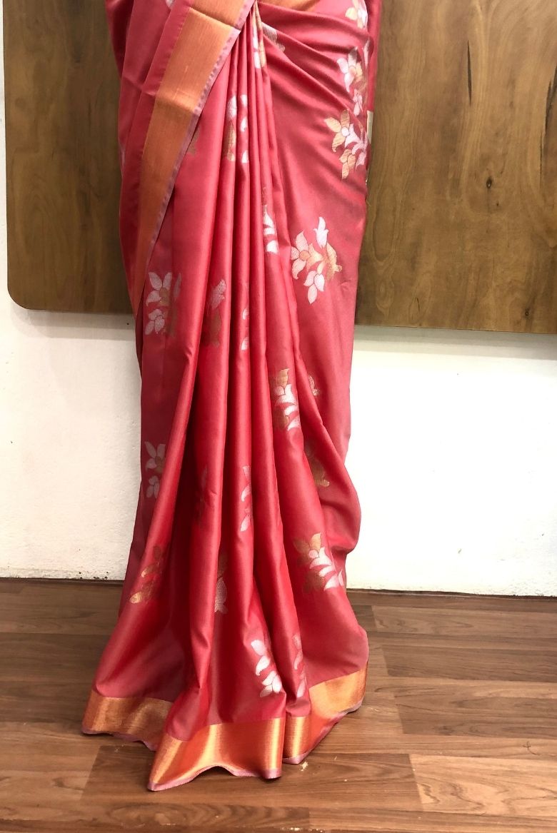 This saree features intricate floral patterns using gold or silver zari threads , golden zari borders , and Pallu is highlighted with contrasting Pista Green colour .