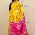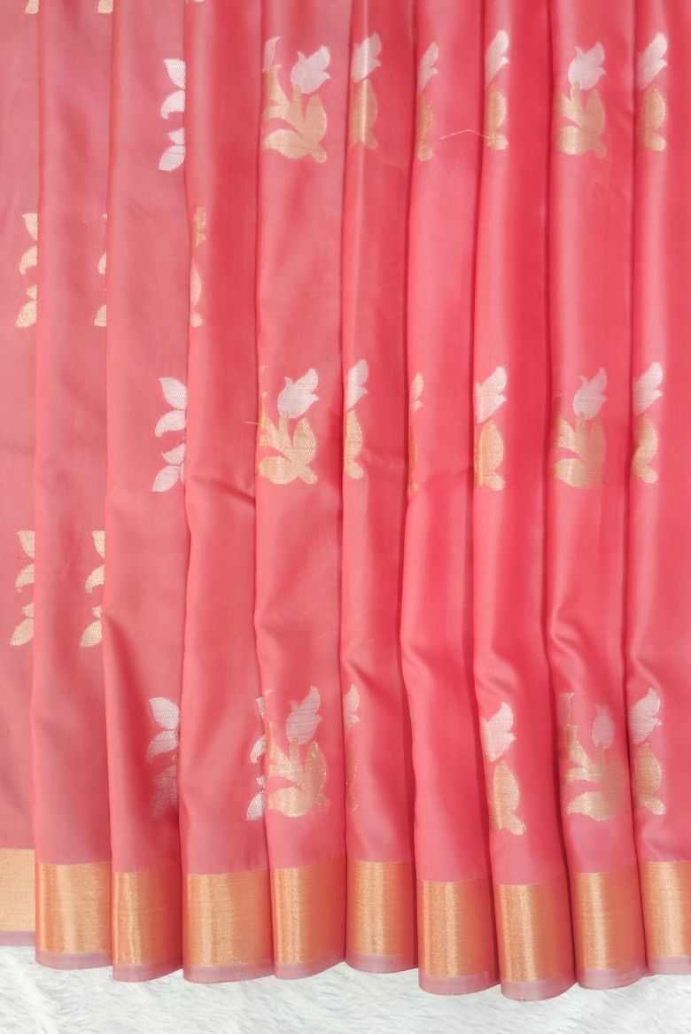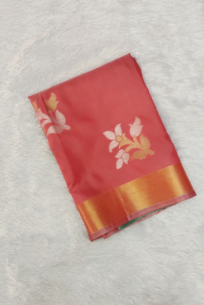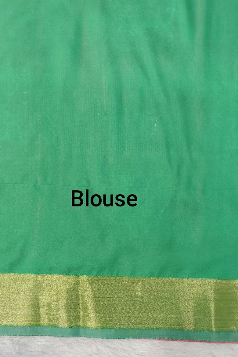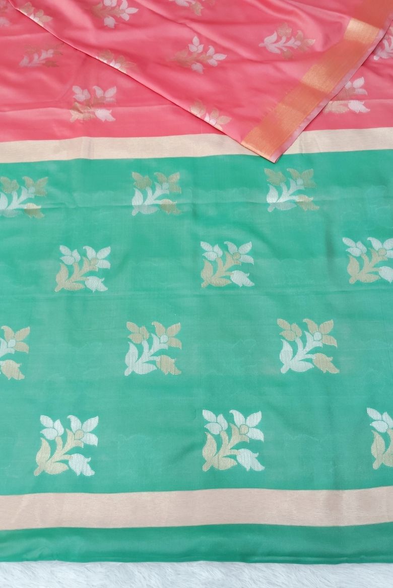 This saree features intricate floral patterns using gold or silver zari threads, golden zari borders, and Pallu is highlighted with contrasting Pista Green color.