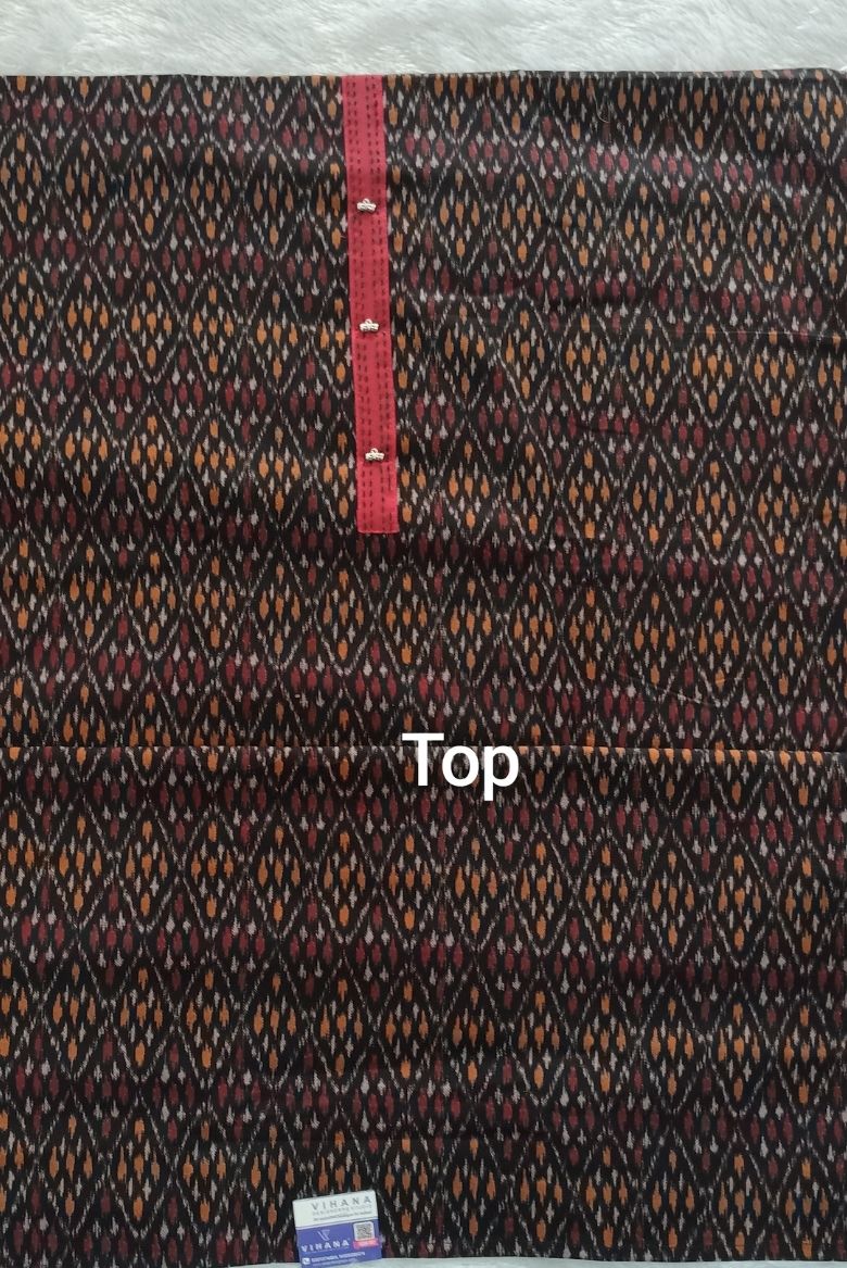 This material featuring a traditional geometric or ikat – style design often refered to as patola print . Perfect for every day wear ,office styling and small occasions ,these unstitched suits offer breathable comfort with timeless ethnic charm .