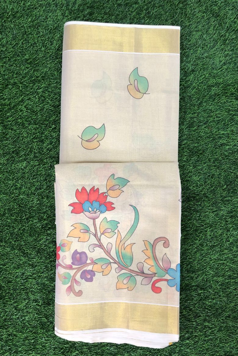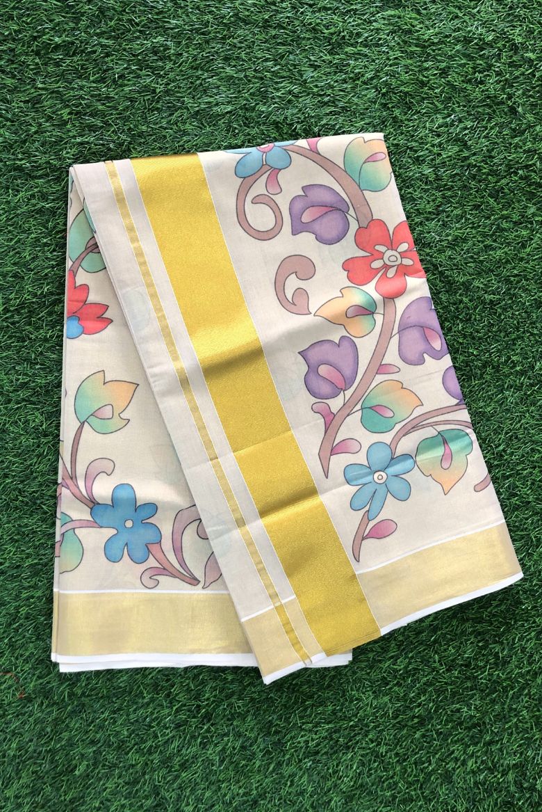 This elegant set saree features a cream or off-white base with a vibrant, multi-colored floral digital print design. It includes a prominent, soft gold zari border and pallu. The intricate floral and vine pattern incorporates various colors such as blue, red, purple, and green, providing a rich and detailed look.