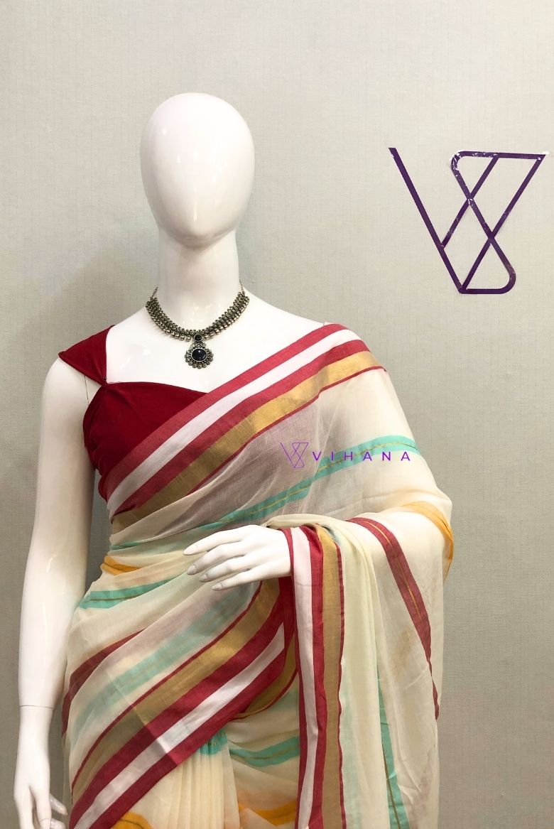 6 February 2026Elegant Cream Pure 120 count Mul Cotton Saree with Vibrant Borders and Hand-knotted Tassels.