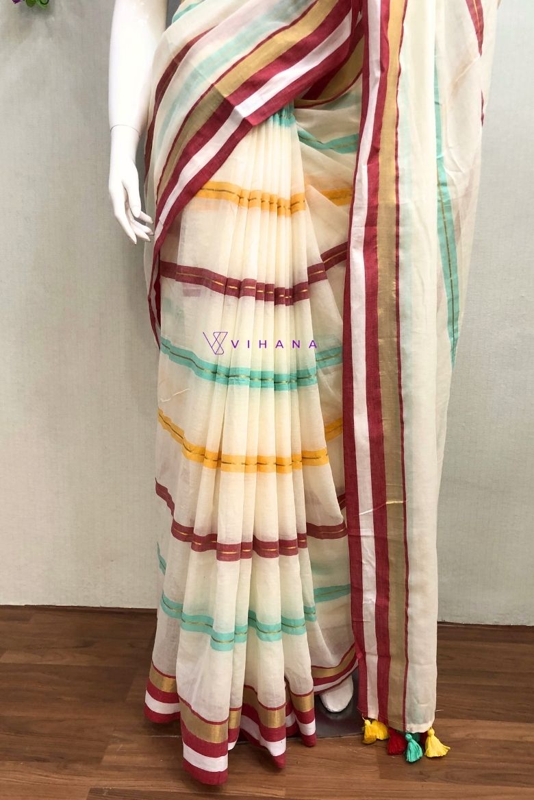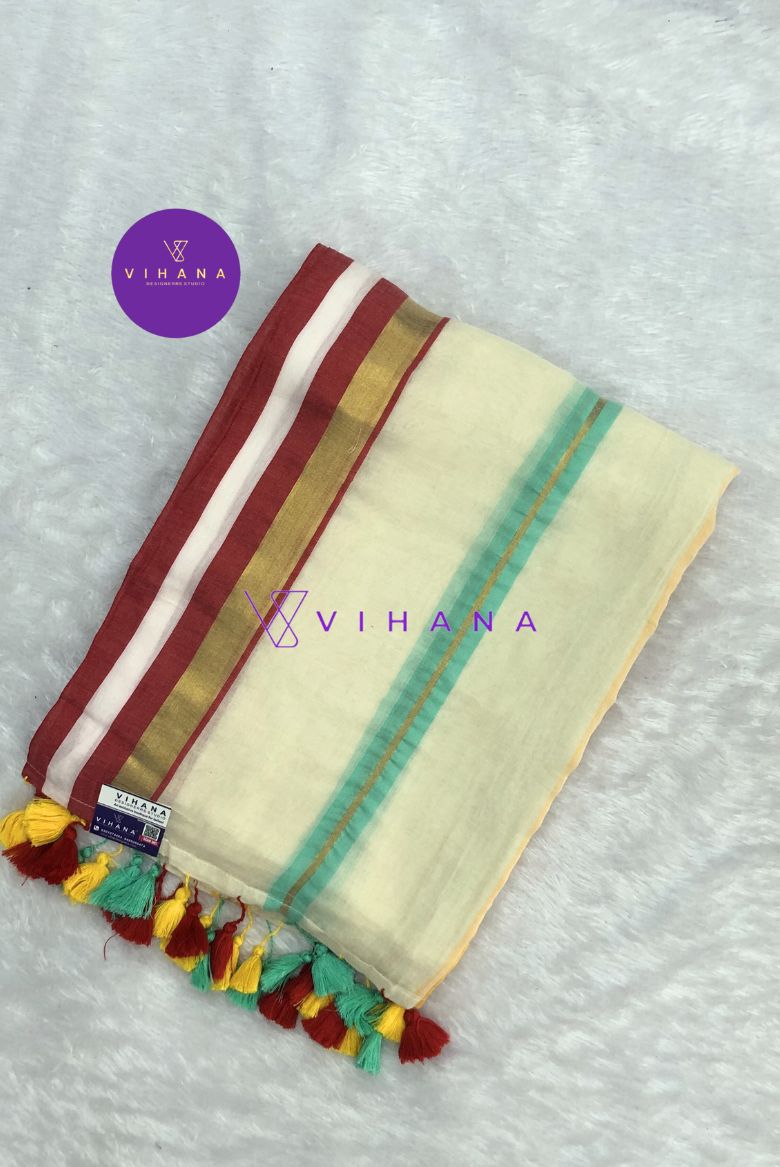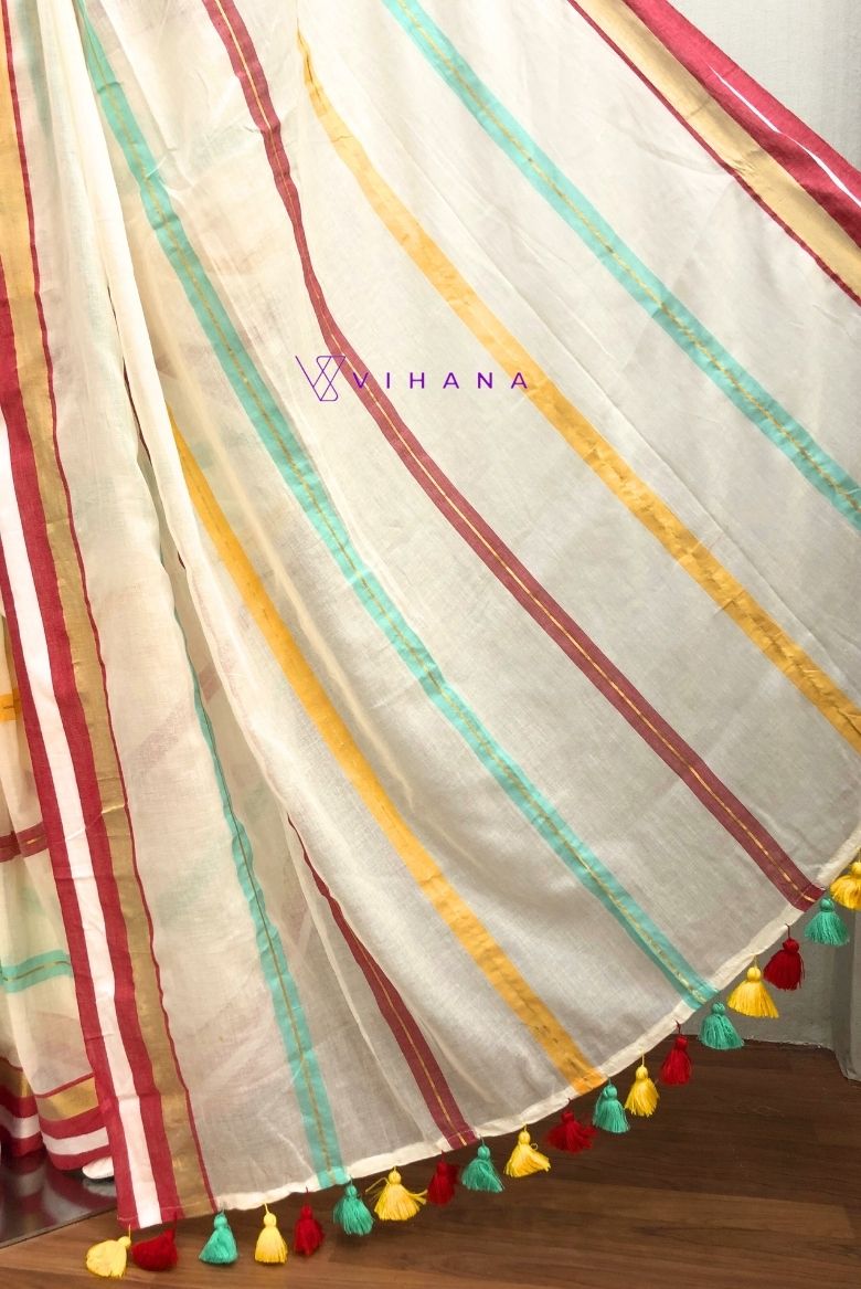 The saree is a serene half-white or light cream shade, accentuated by a striking border featuring a mix of green/teal, deep red, and radiant golden zari threads.Hand-knotted tassels in red, green, and yellow provide a distinctive, artisanal finish to the pallu.