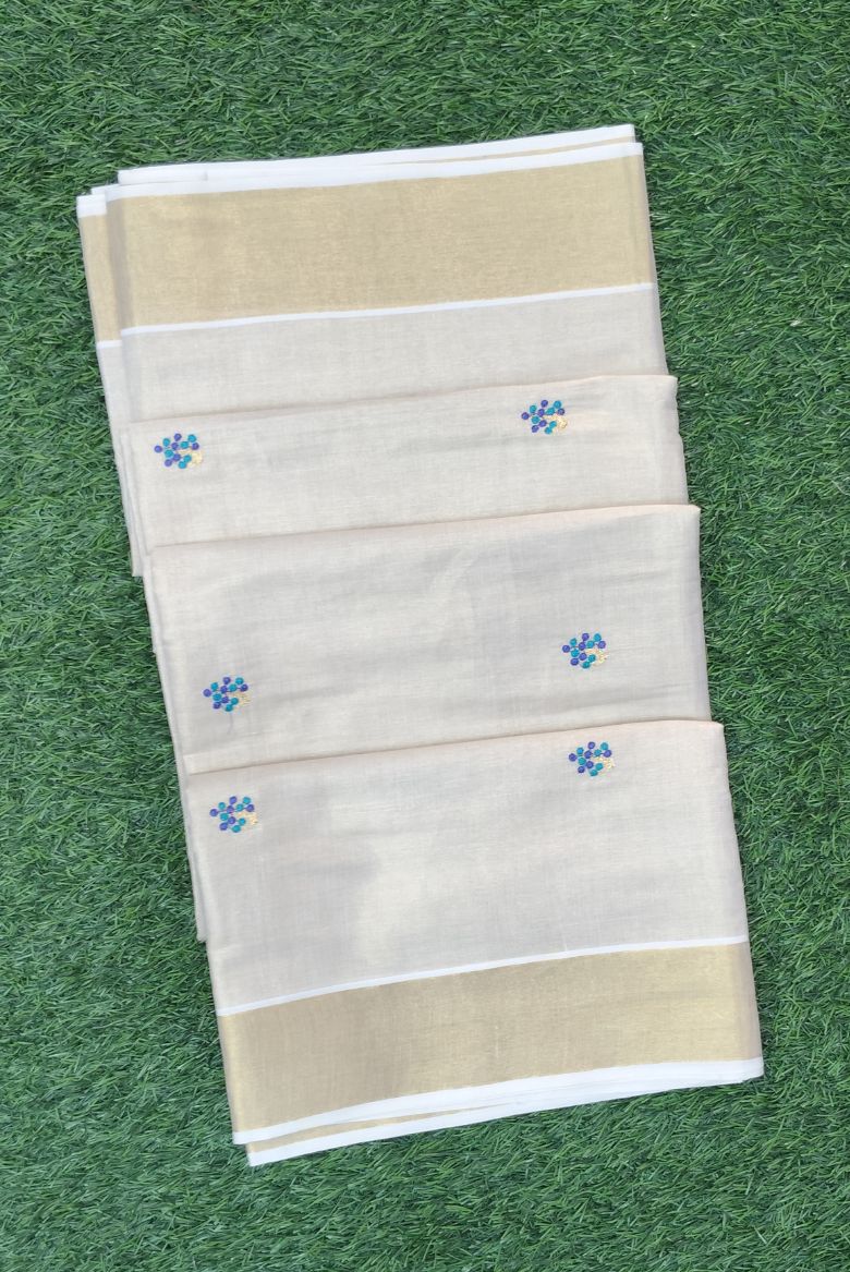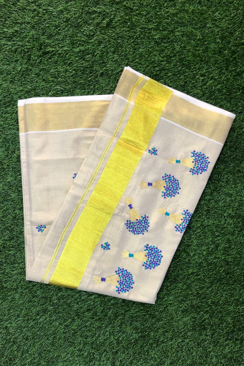 This Set Saree features classic Kasavu (gold zari) border that defines its traditional roots and floral bouquet embroidery on overall body and pallu.