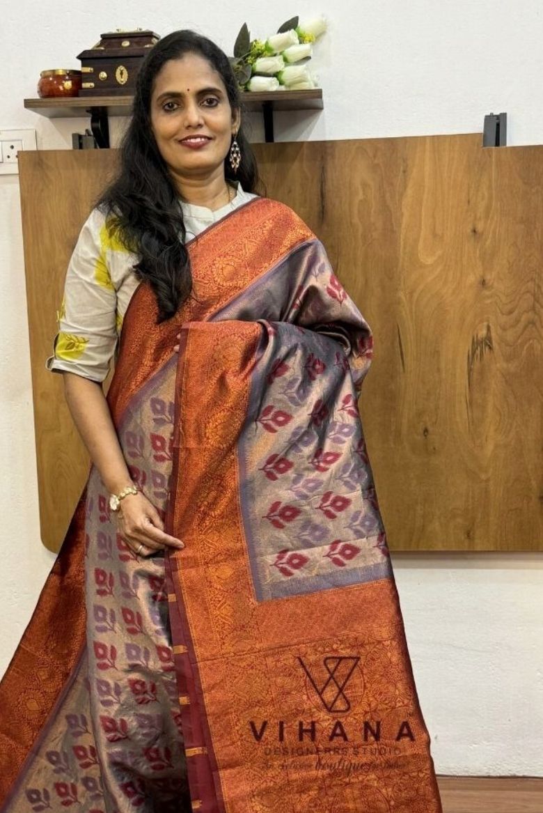 Grey&golden zari mixed weaving kanjivaram silk saree ,having purple & beetroot red coloured floral motifs , with golden zari work thick maroon border , floral designed Pallu.