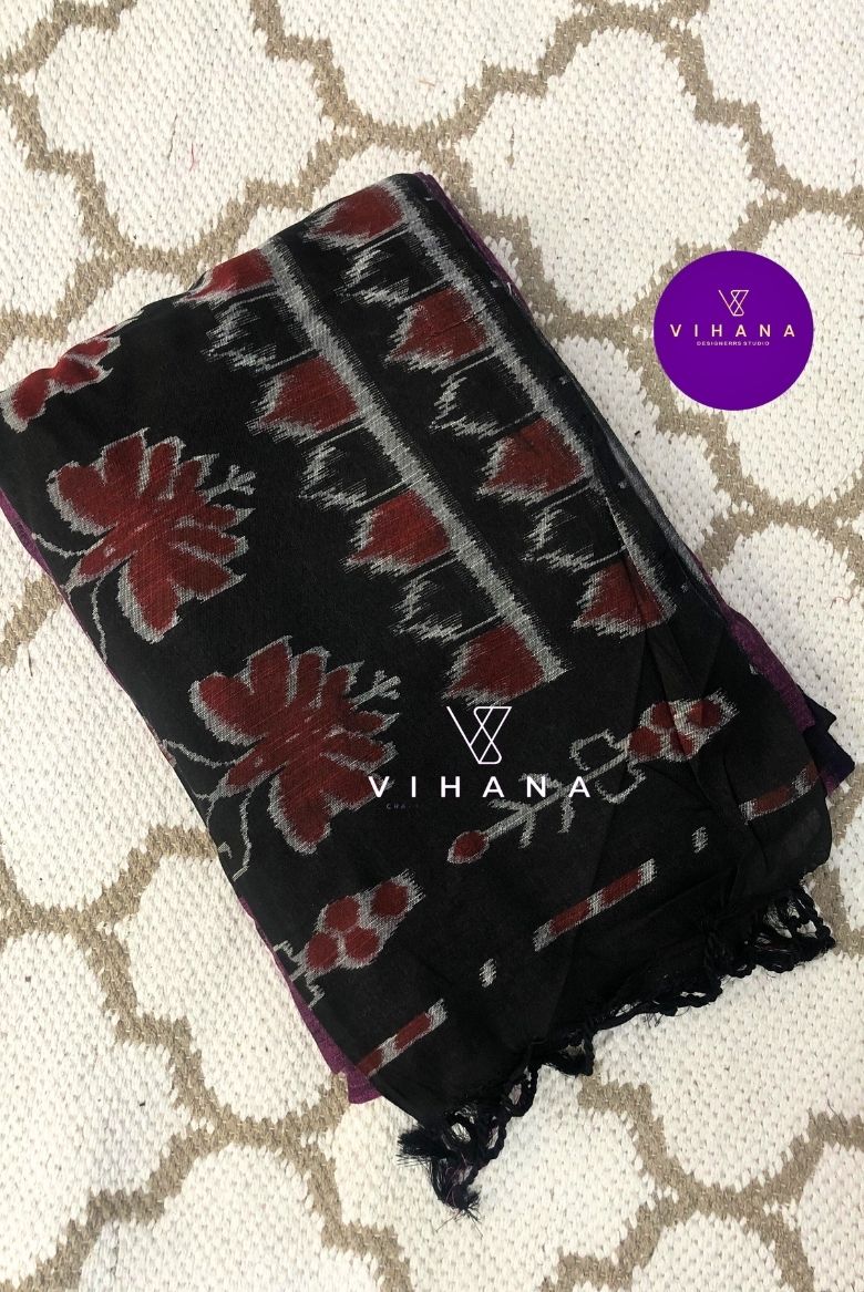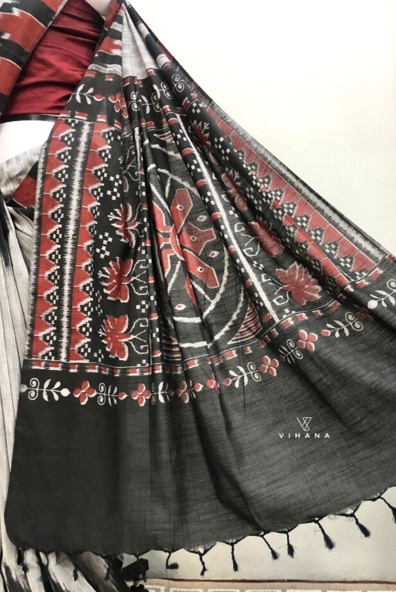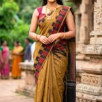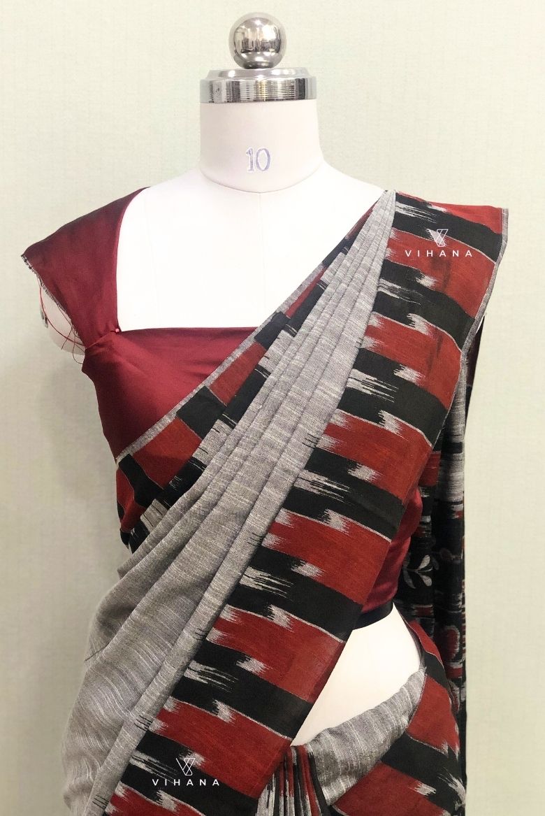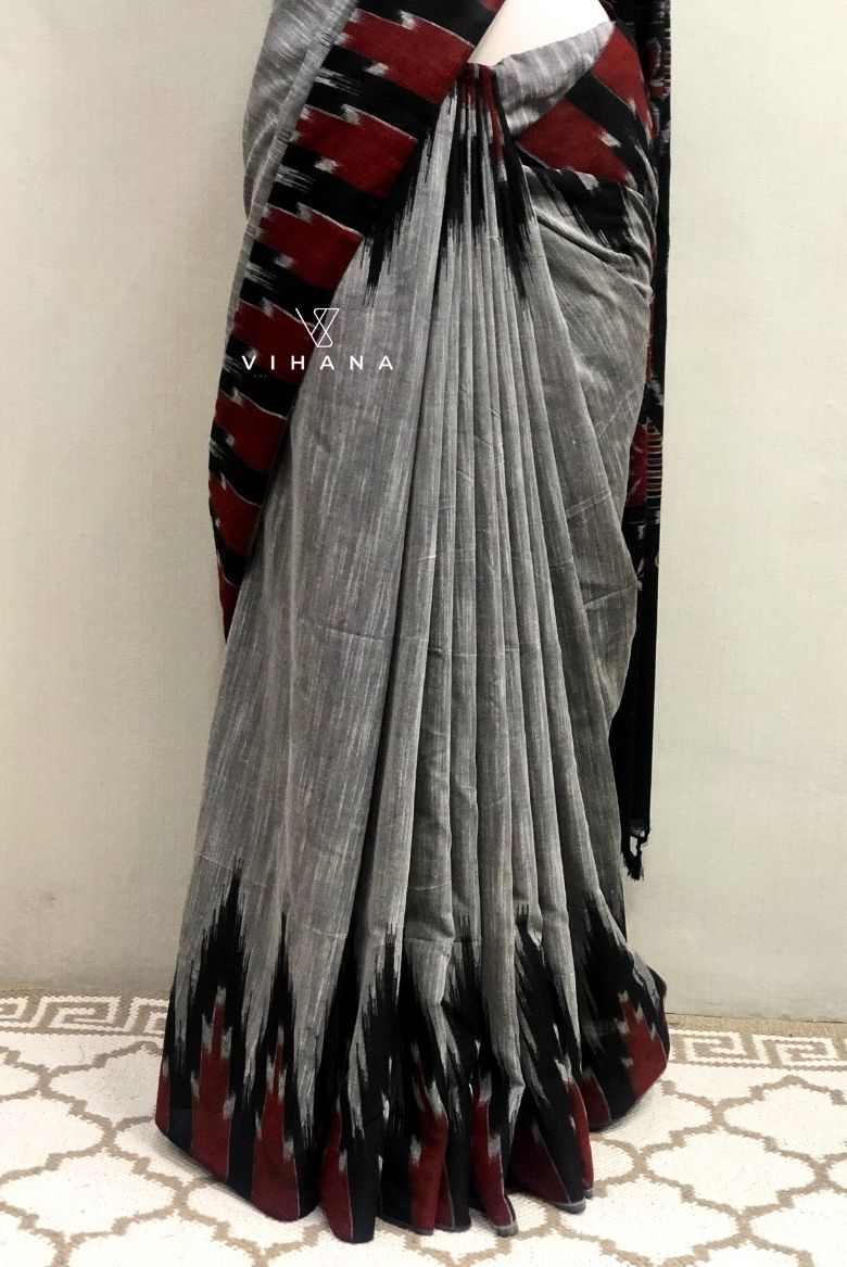 The grey saree features prominent maroon and black checkered temple borders, which are a signature element of this style. The pallu decorative may incorporate traditional motifs.