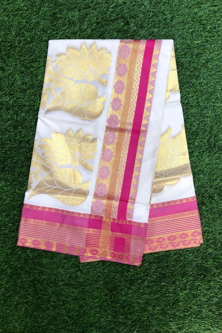 The body of Set Saree Adorned with large, intricate Golden Lotus (Kamalam) motifs woven throughout the fabric, symbolizing purity and prosperity. A dual-tone border featuring classic Gold Kasavu paired with a vibrant Rani Pink (Magenta) stripe, decorated with delicate floral patterns. A rich combination of thick gold zari and pink stripes that adds a regal finish to the drape.