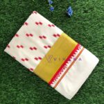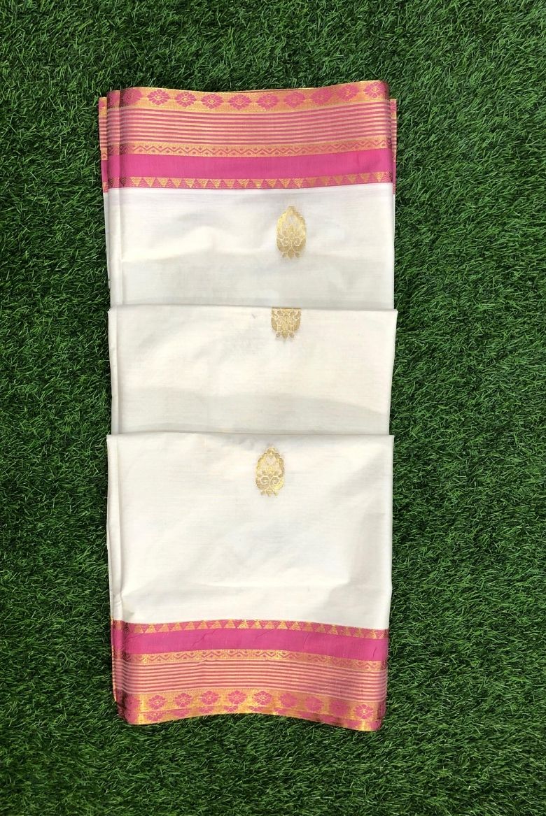 23 January 2026Kerala Cotton Premium Set Saree with Pink Border and Gold Zari Woven Floral Designs