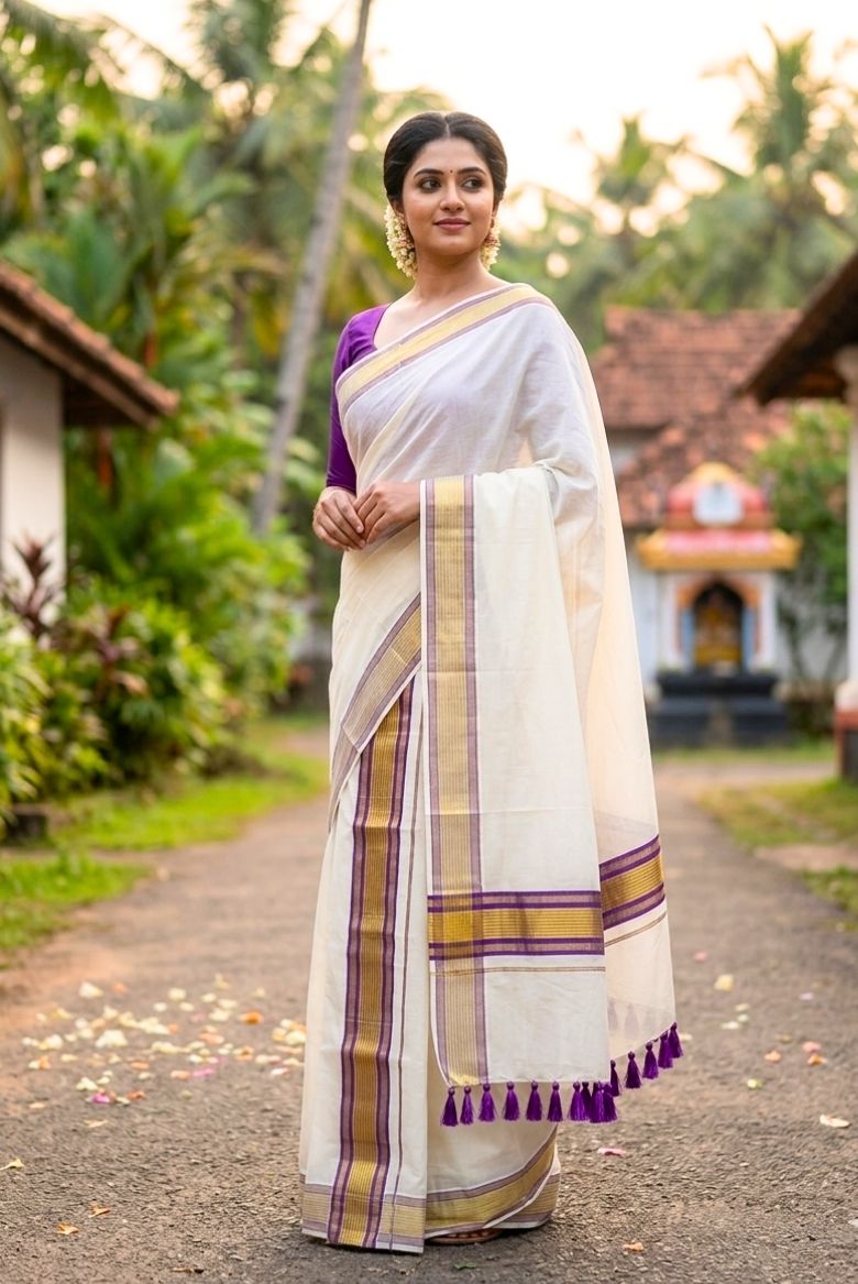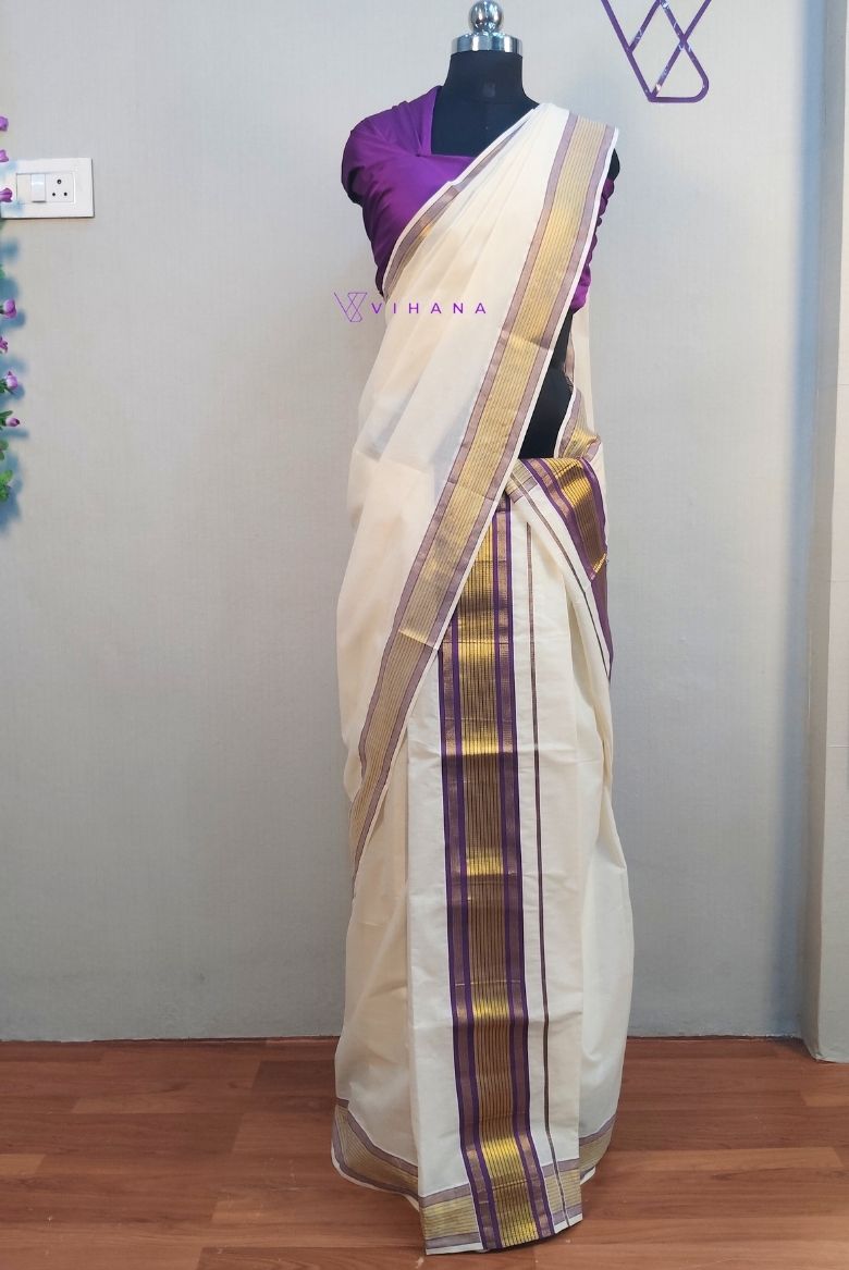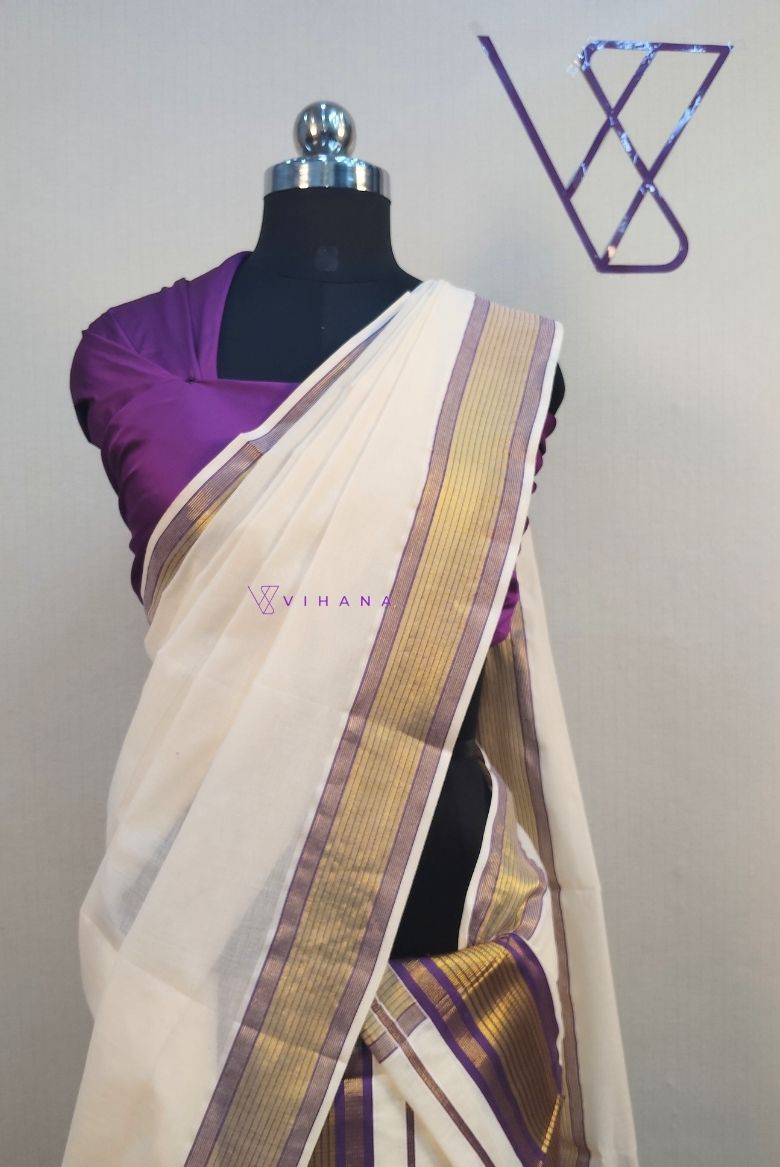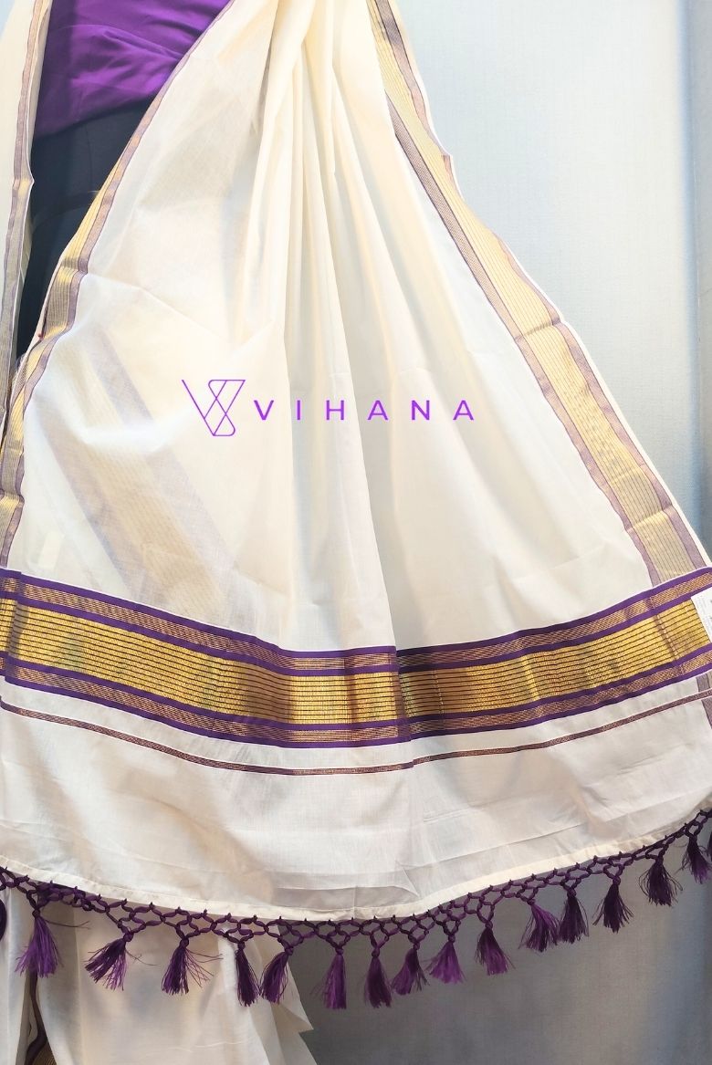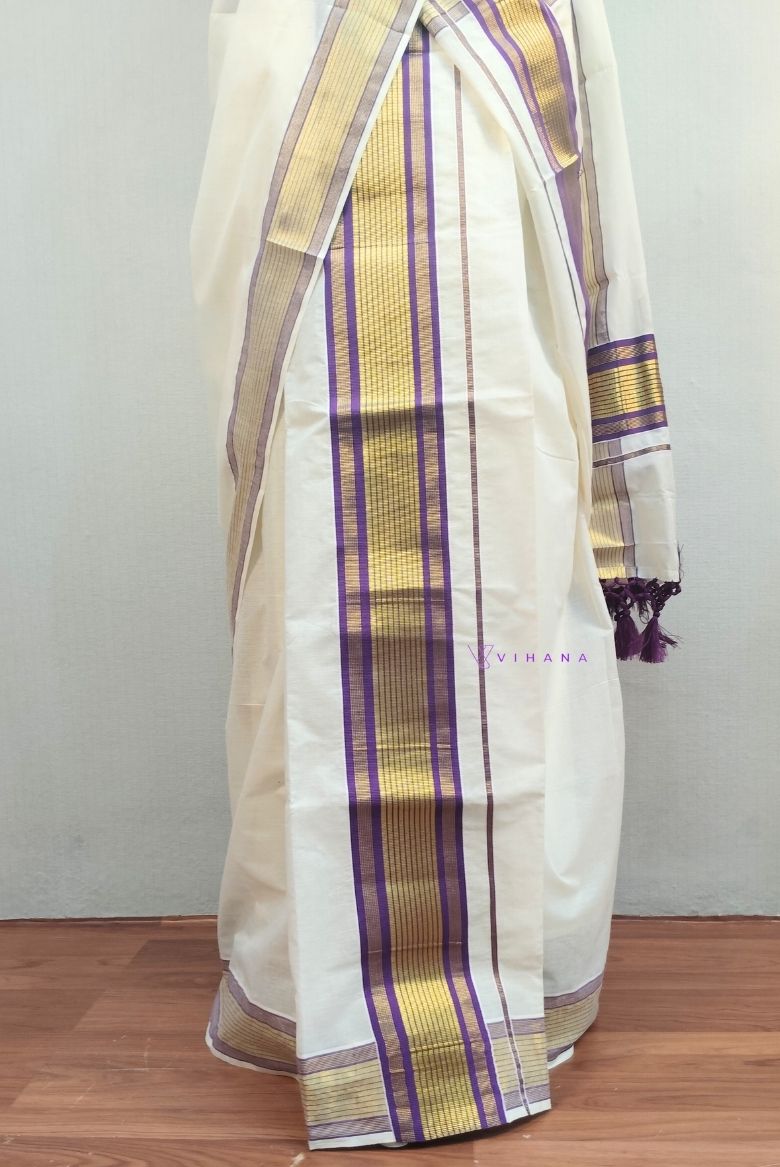 This set mundu features a classic off-white with a prominent purple and Golden Zari border. A distinct purple and golden strip design is visible along the edges.