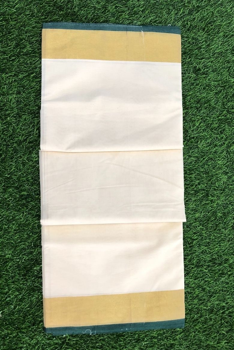 This set saree features a traditional kasavu (zari) border in gold, accented with a distinct green line or band along the edge.