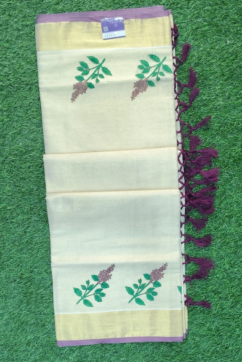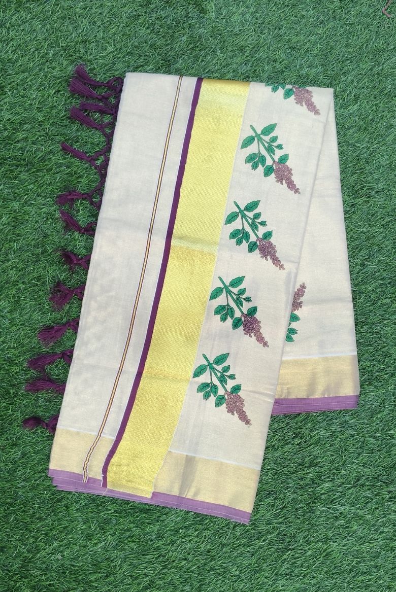 Kerala Golden Tissue Set Saree with Thulasikathir Printed Designs - Vihana