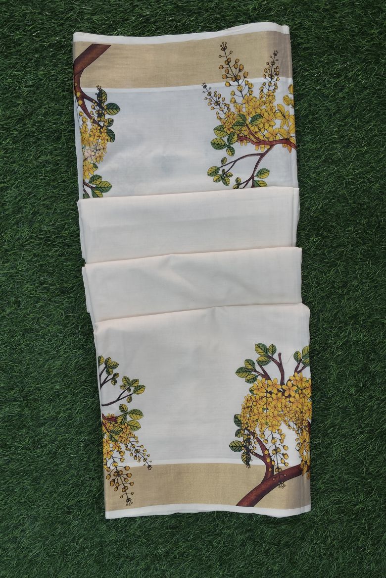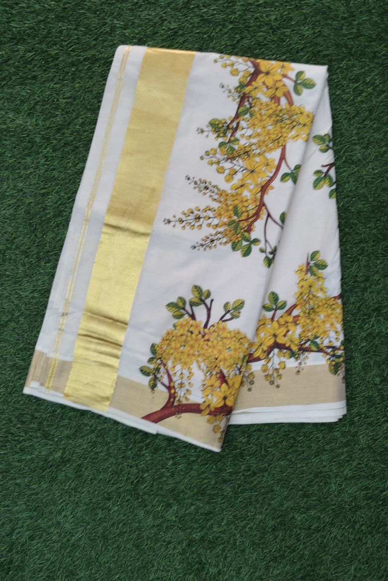 This traditional Kerala saree features the distinct gold border and a vibrant print of the yellow kanikkonna flowers in the body part and highlighted pallu , which are culturally significant in Kerala.