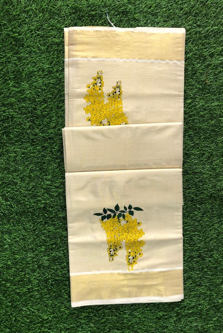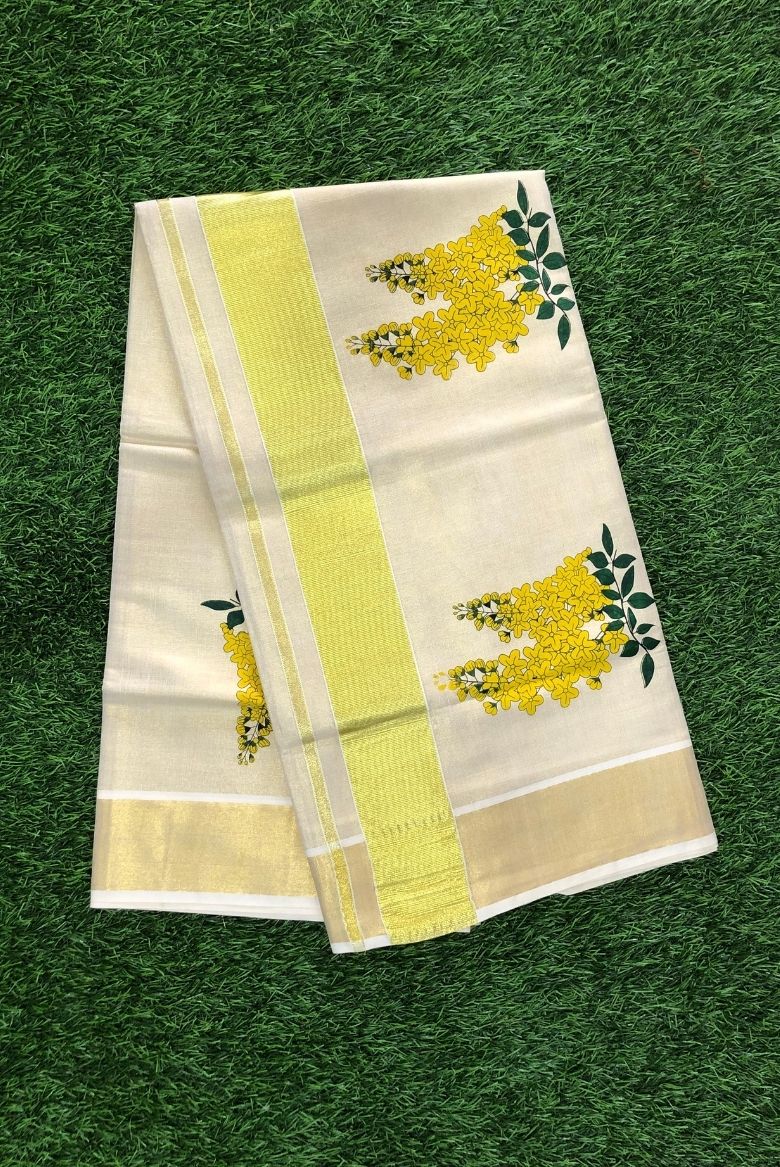 This elegant tissue silk saree features a pristine off-white body with a classic golden kasavu border, adorned with vibrant yellow Kanikonna (cassia fistula flower) motifs and green leaves.