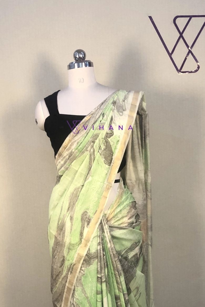 - It includes a subtle zari border (metallic thread work) that adds a touch of traditional sophistication. The pallu (end piece) is finished with delicate tassels,, a common feature in modern handloom-style sarees.saree Length: 6.30m