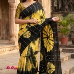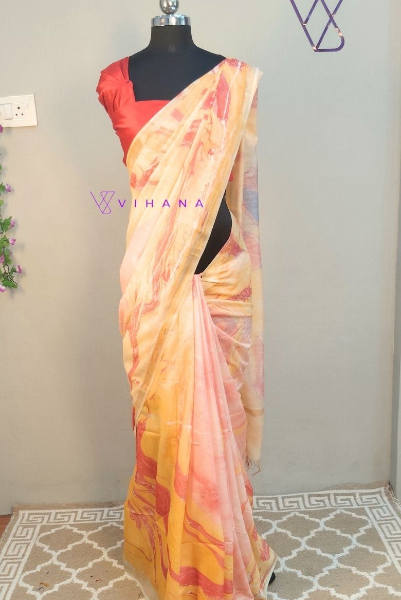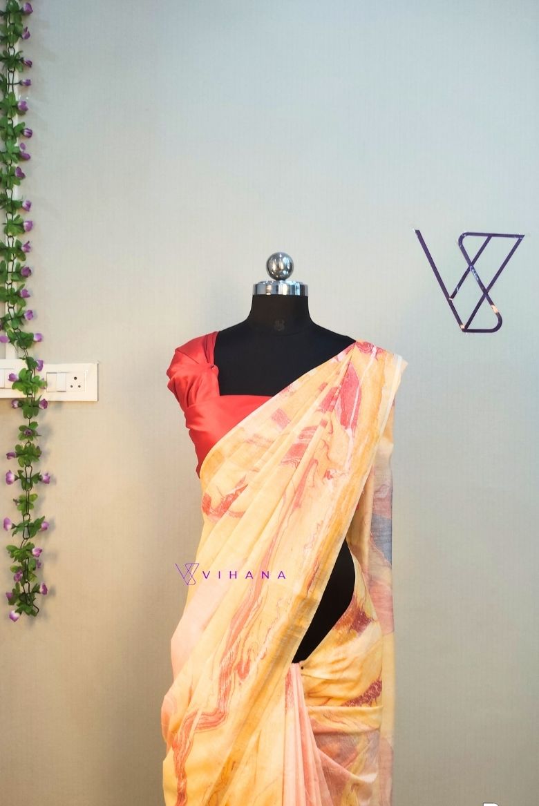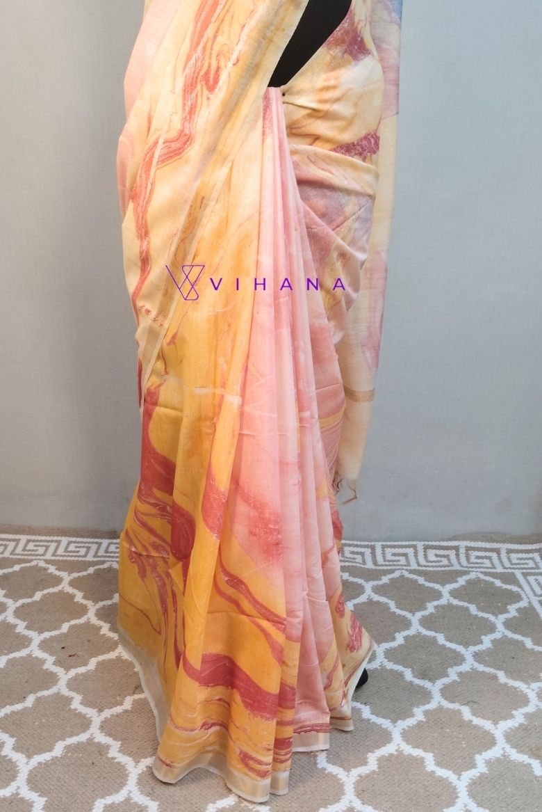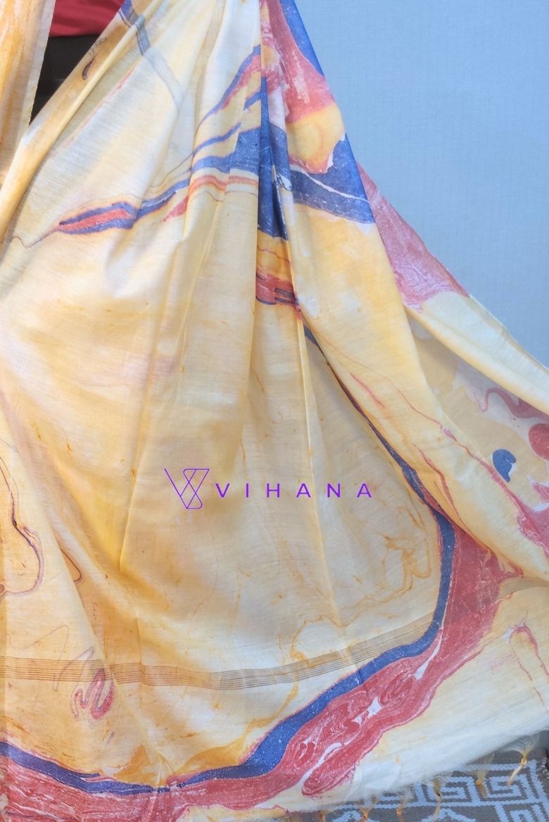 The saree shown is a yellow-toned garment featuring a distinctive hand-marble print or abstract swirl pattern in shades of orange, red, and blue. This artistic technique creates a fluid, “liquid-like” design that mimics the natural veining found in marble stone.