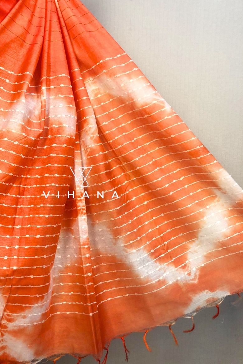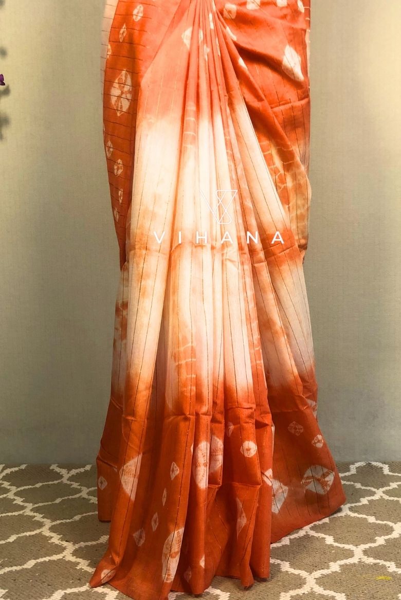 The saree features a rich black base is beautifully contrasted with vibrant mustard yellow patterns, creating a unique shibori-inspired design that stands out effortlessly. Subtle linear accents add a touch of structure to the fluid artistry of the tie-dye.The body features a distinctive marble print in earthy tones of peach, orange, and deep purple-grey, creating a sophisticated abstract aesthetic.The saree is finished with a thin zari -woven border that adds a touch of traditional heritage. It often includes delicate tassels on the pallu to enhance its graceful movement.
