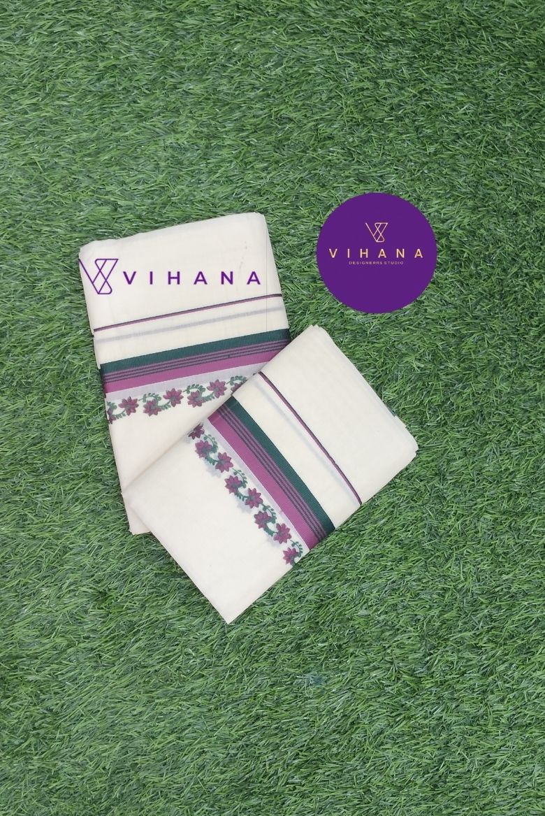 Traditional Kerala Set Mundu with Turquoise and Golden Zari Border